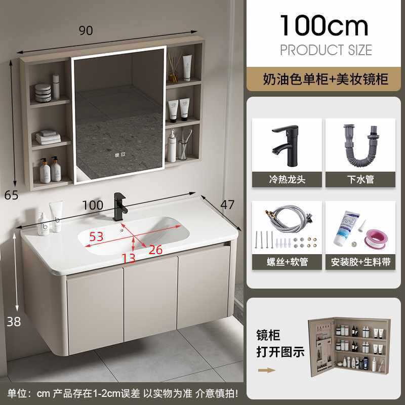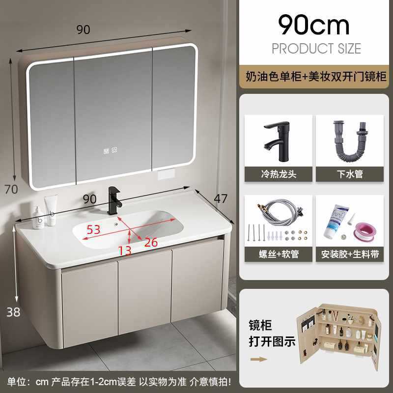 • 90 얇은 모서리 둥근 세면대 캐비닛 + 수도꼭지 + 스마트 뷰티 거울 캐비닛