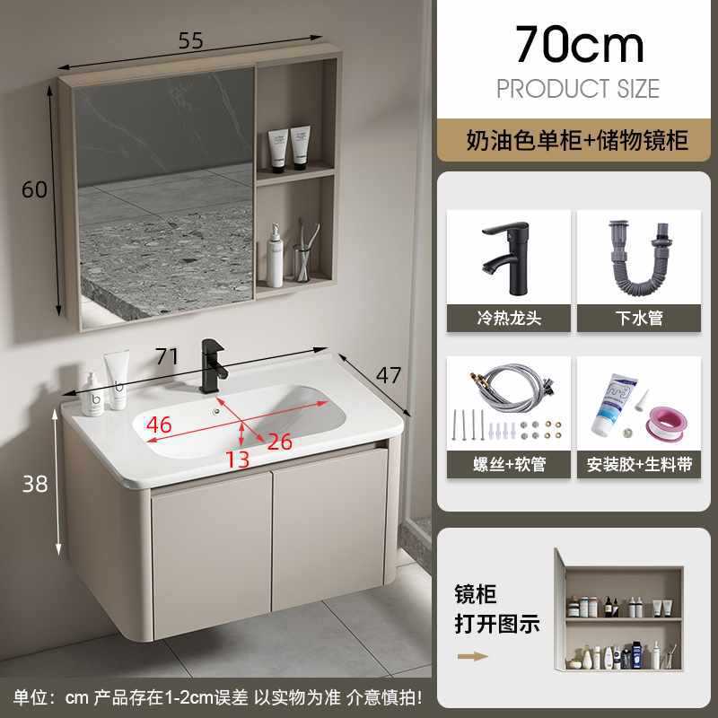 • 70 얇은 모서리 둥근 세면대 캐비닛 + 수도꼭지 + 수납 거울 캐비닛