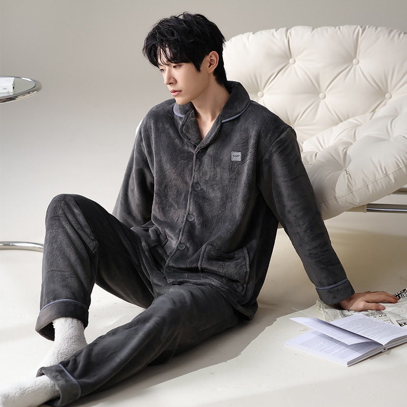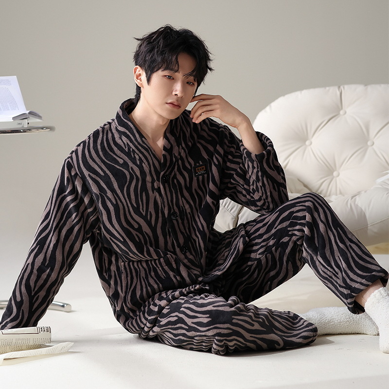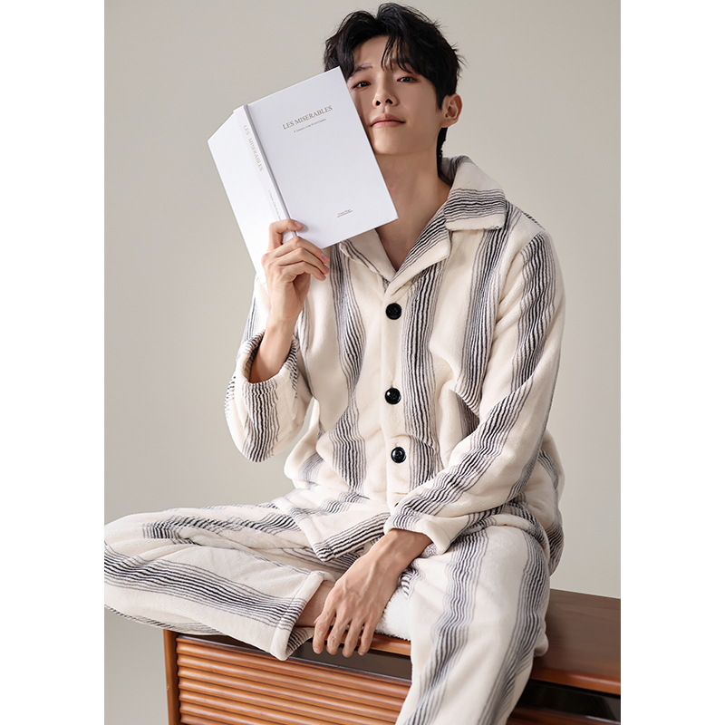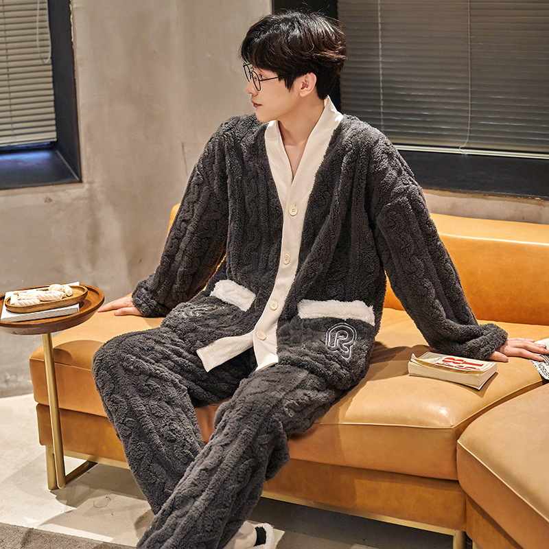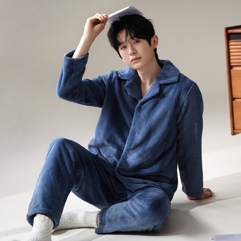 사슴 시간 산호 양털 파자마 남자 가을과 겨울 두꺼운 남자 세트 기모 플란넬 남자 집 옷 봄과 가을스토어 가기