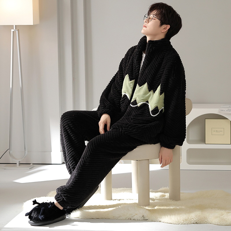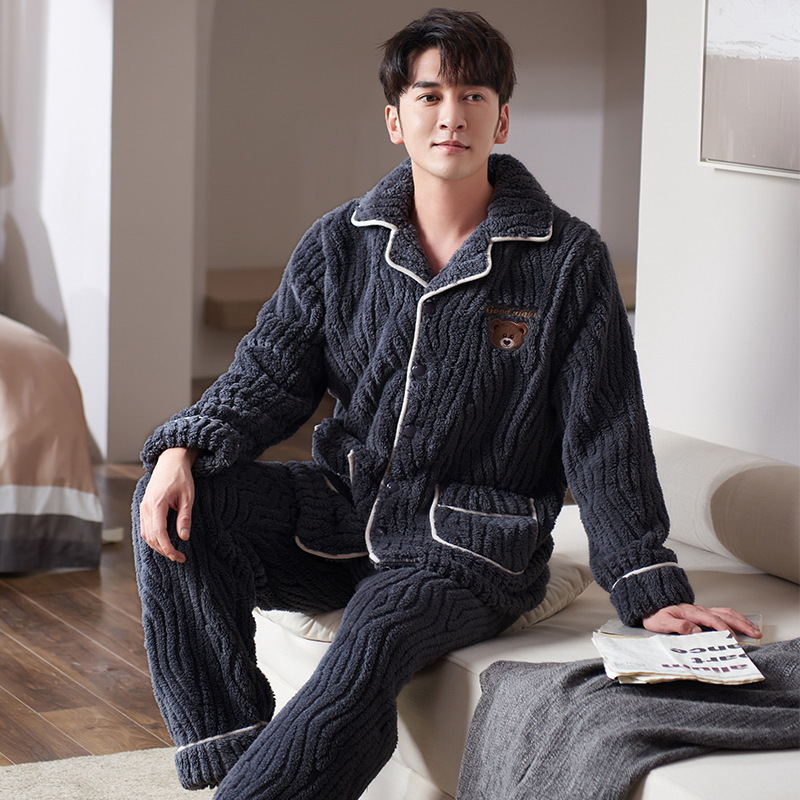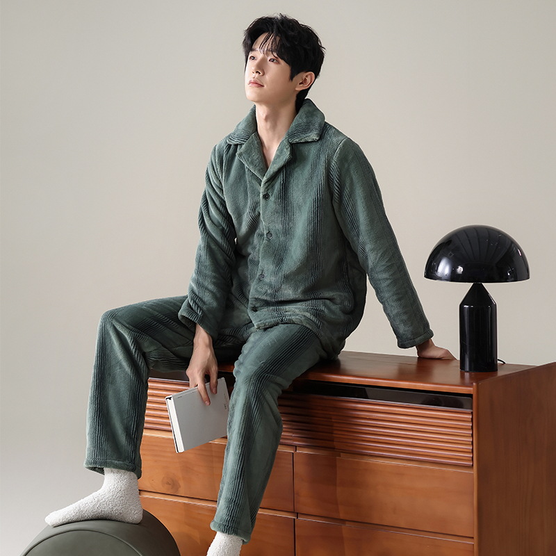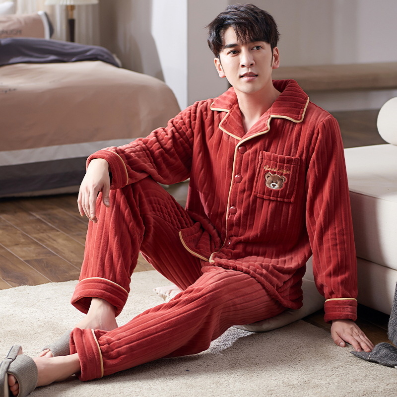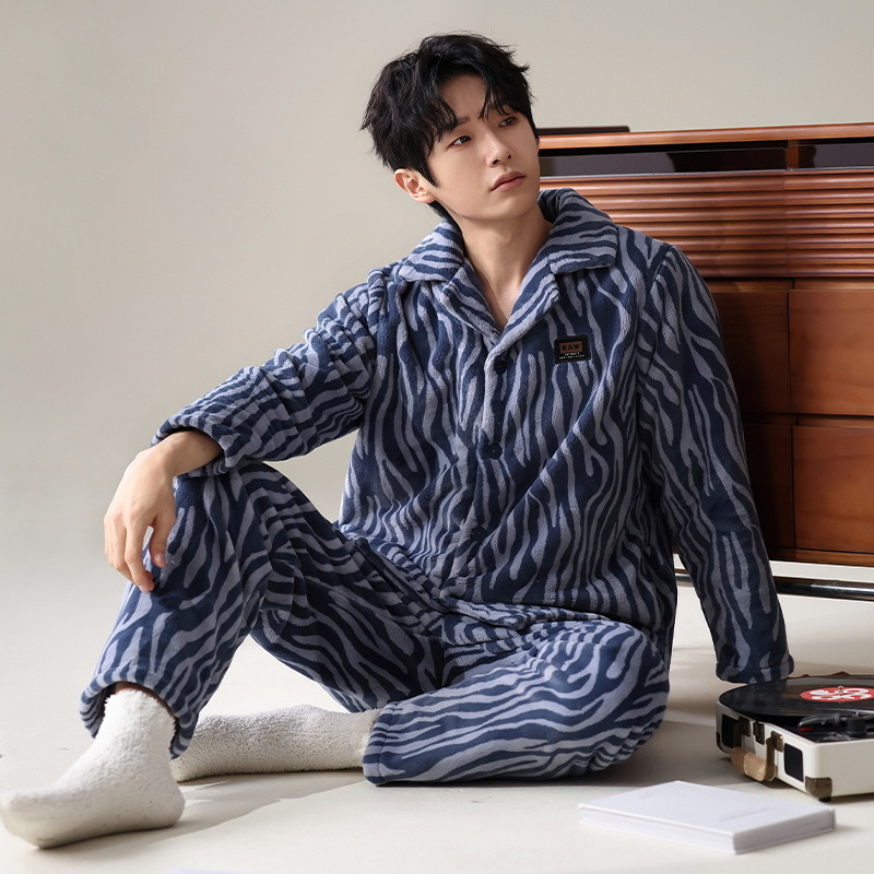 사슴 시간 산호 양털 파자마 남자 가을과 겨울 두꺼운 남자 세트 기모 플란넬 남자 집 옷 봄과 가을