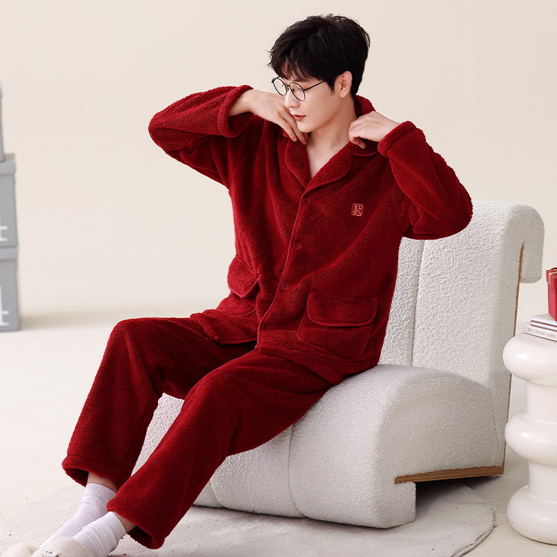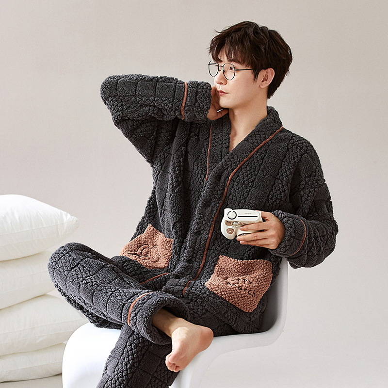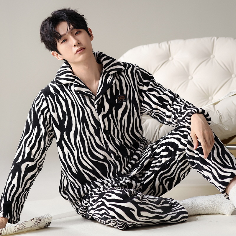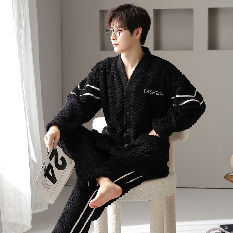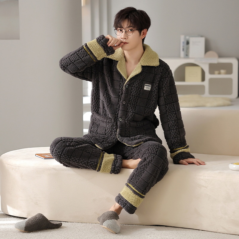사슴 시간 산호 양털 파자마 남자 가을과 겨울 두꺼운 남자 세트 기모 플란넬 남자 집 옷 봄과 가을