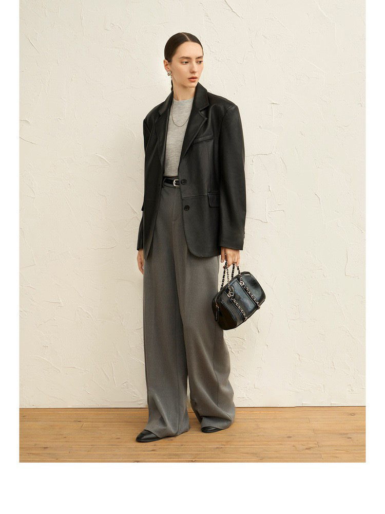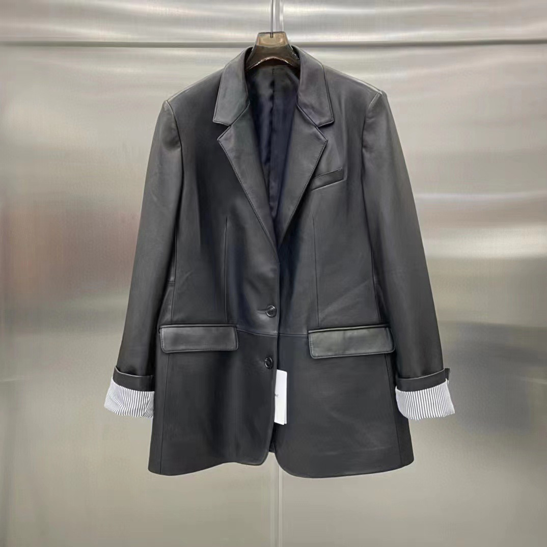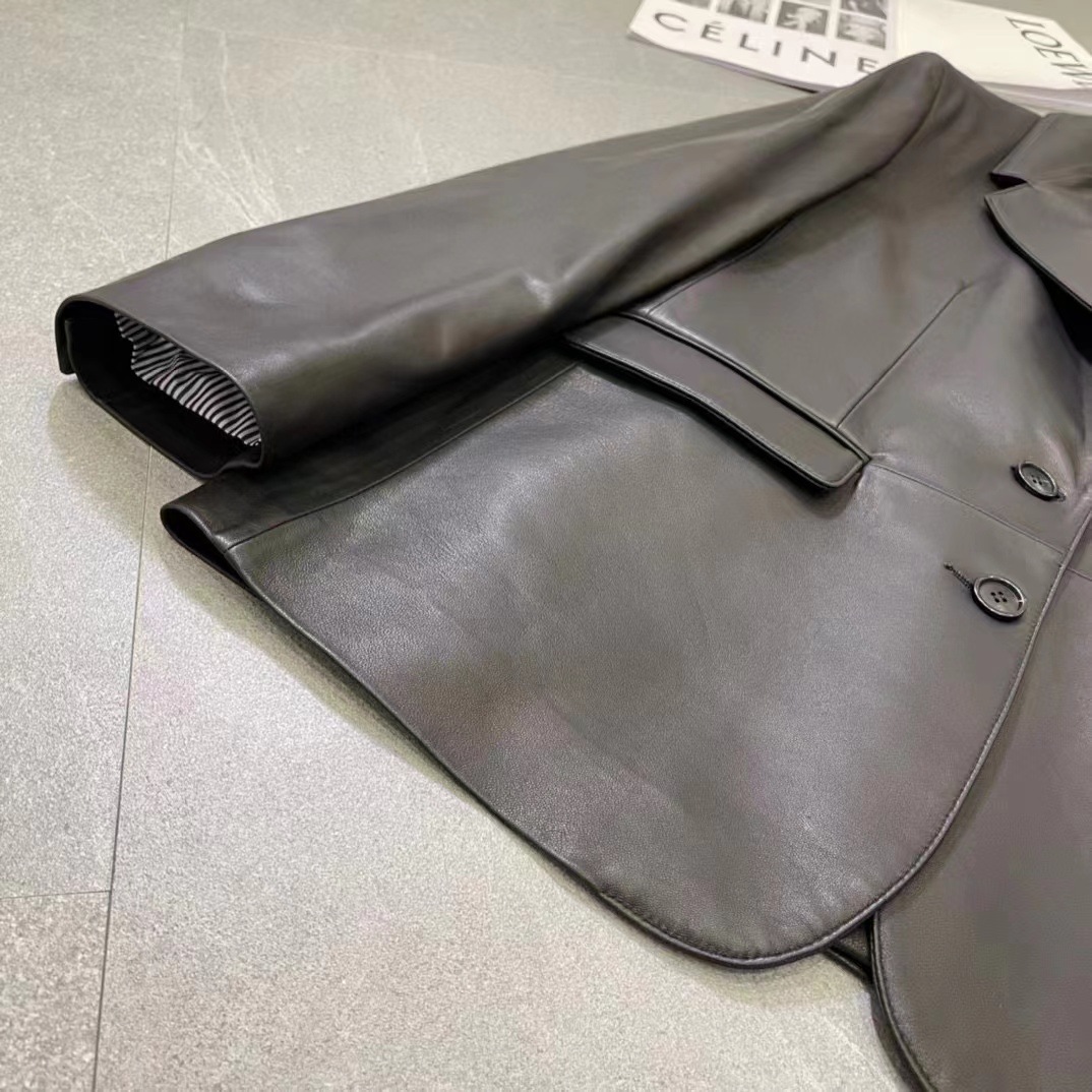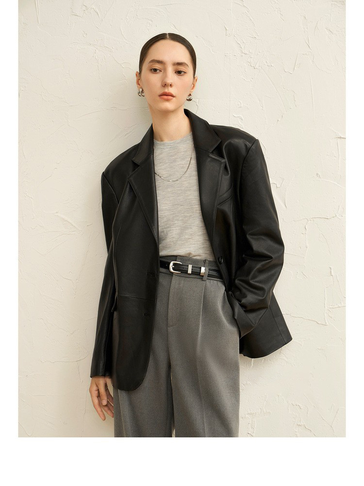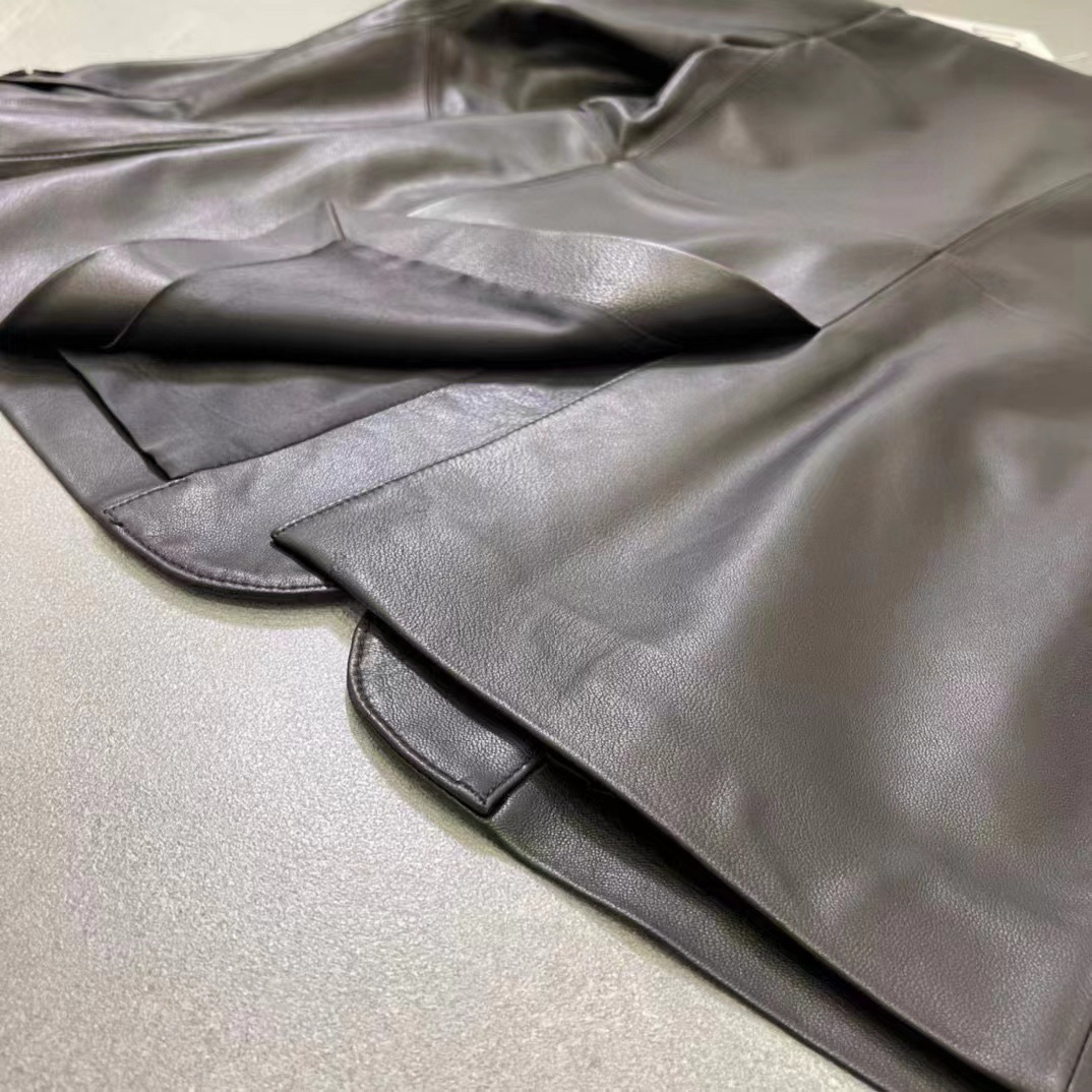 빈티지 실루엣 플랫 바지선 칼라 얇은 H 자형 가죽 가죽 세트 코트 여성의 가을 2024 새로운 양 가죽 코트스토어 가기