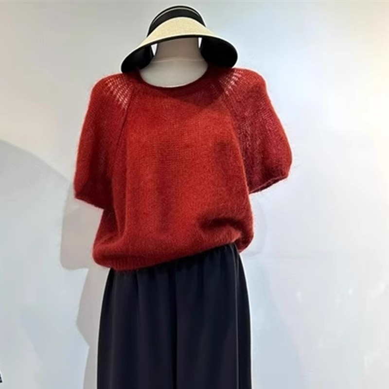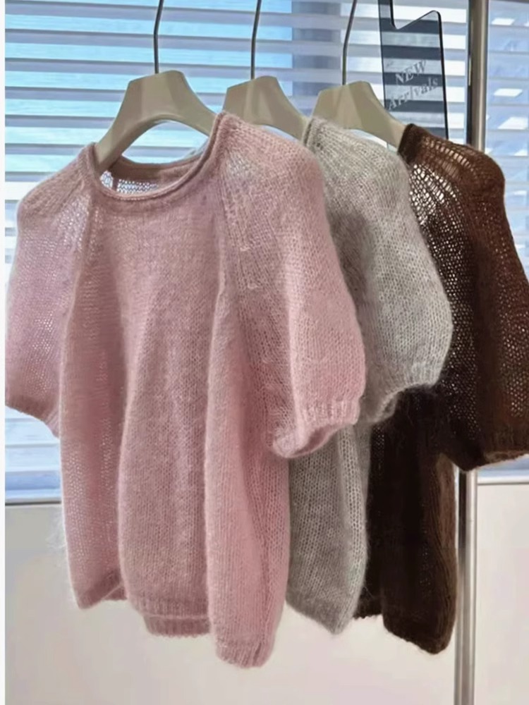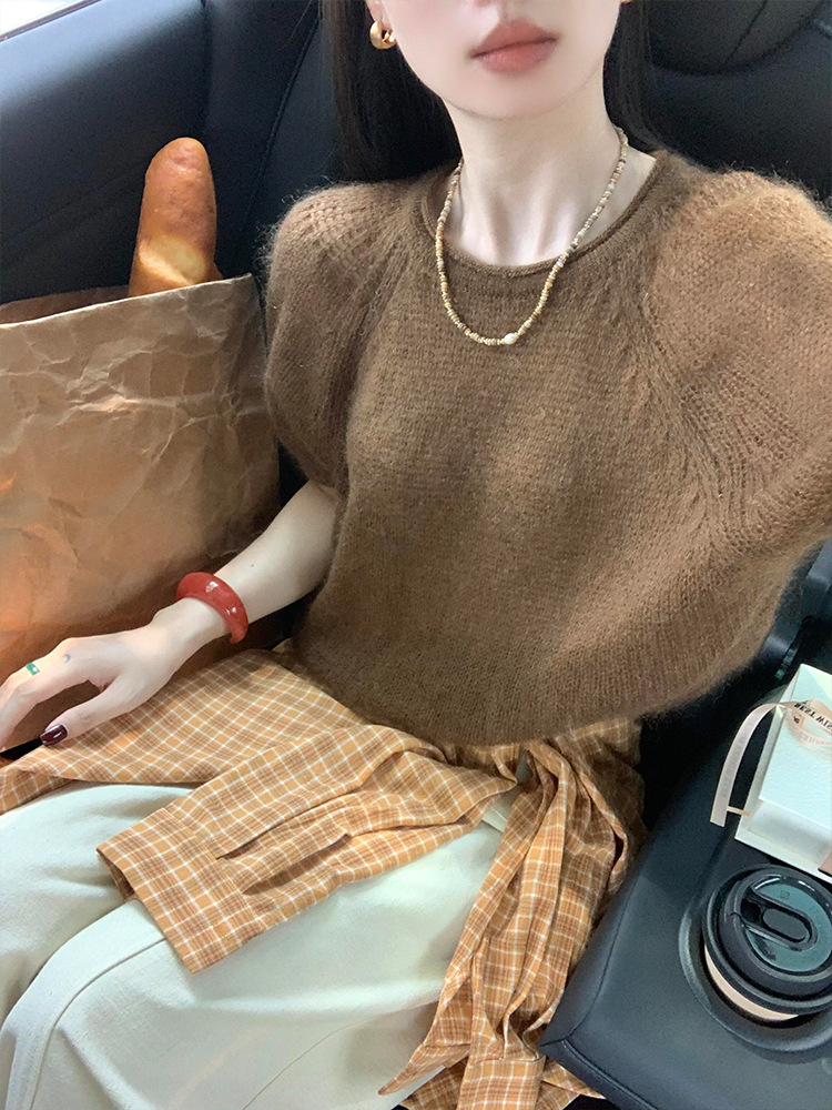 가을 겨울 여성용 새로운 스타일의 퍼프 슬리브 모헤어 반팔 스웨터 하이 엔드 라운드 넥 풀오버 스웨터 탑