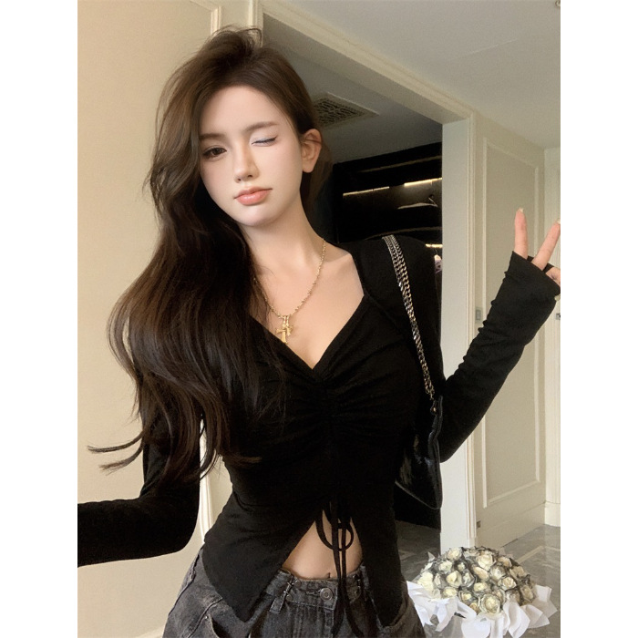 순수한 원하는 유방 공개 탑 드로 스트링 허리 슬리밍 독특한 시크한 혼 긴팔 티셔츠 봄과 가을 2024 새로운 여성 의류스토어 가기