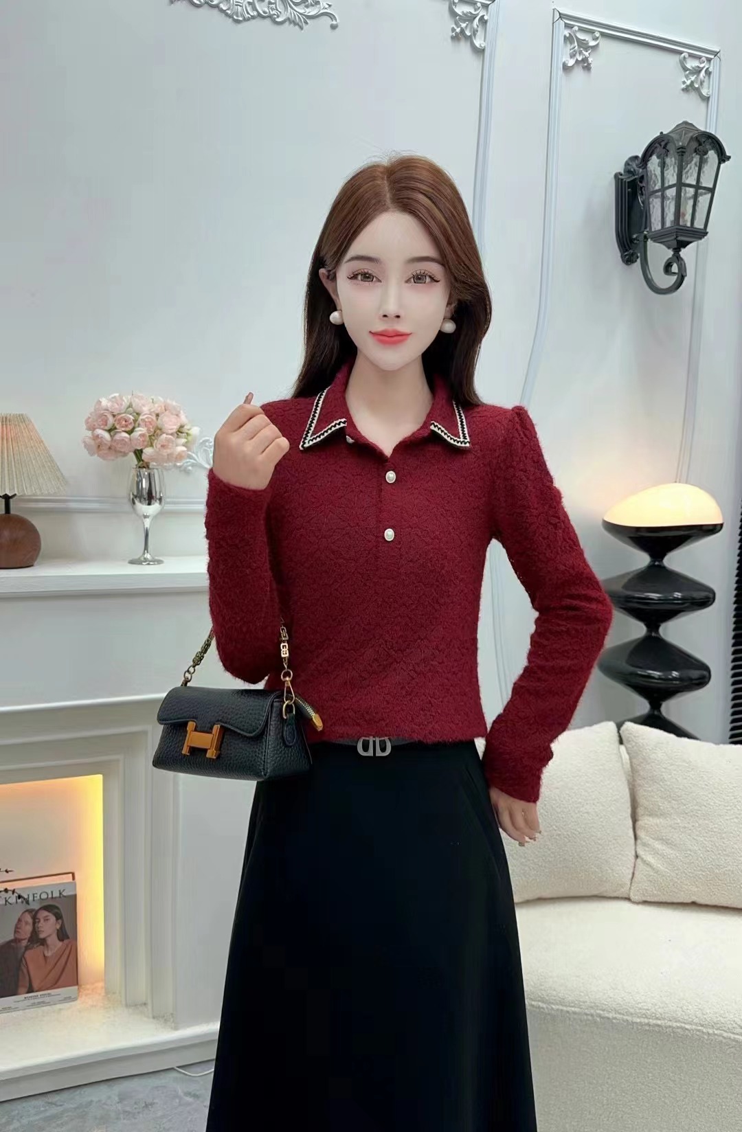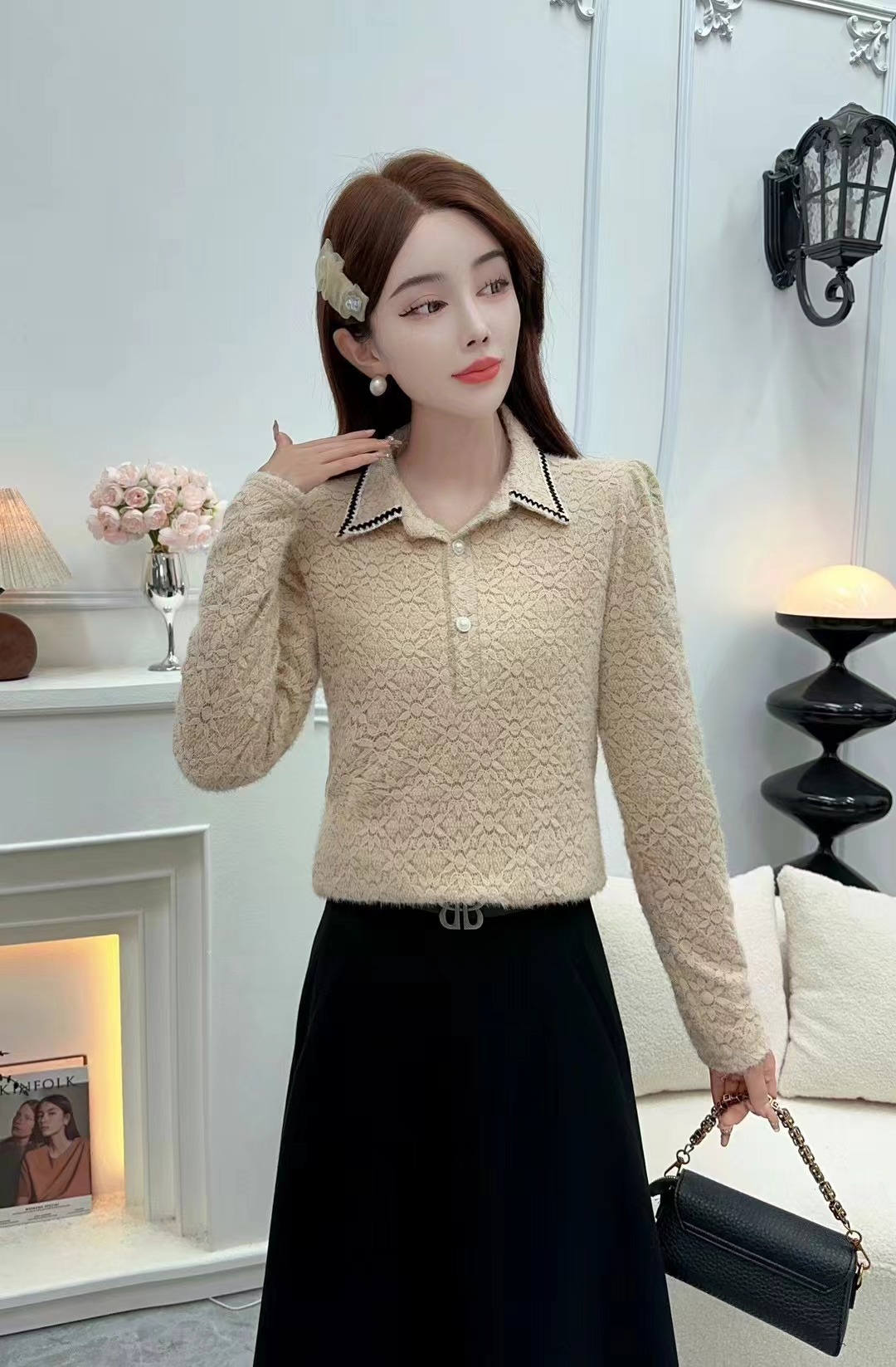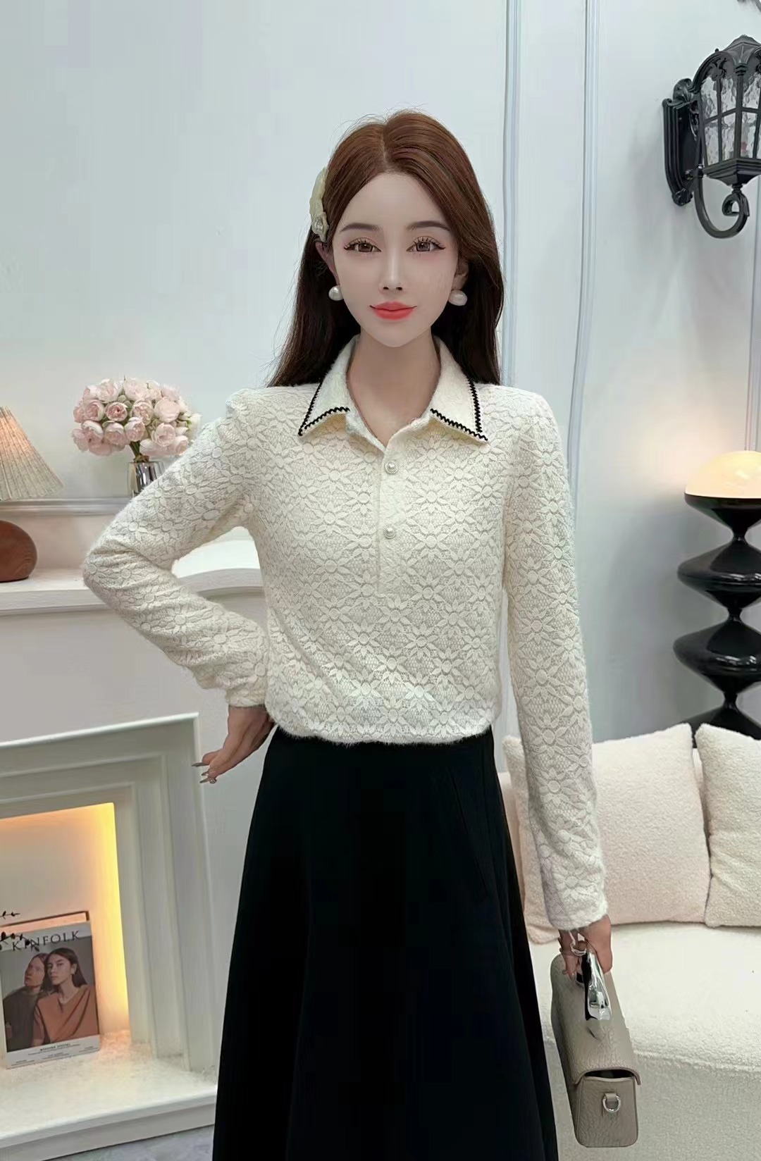 폴로 칼라 긴 소매 레이스 셔츠 여성의 2024 년 봄과 가을 새로운 슬림 슬림 달콤한 크로 셰 풀러베이스 셔츠 탑스토어 가기