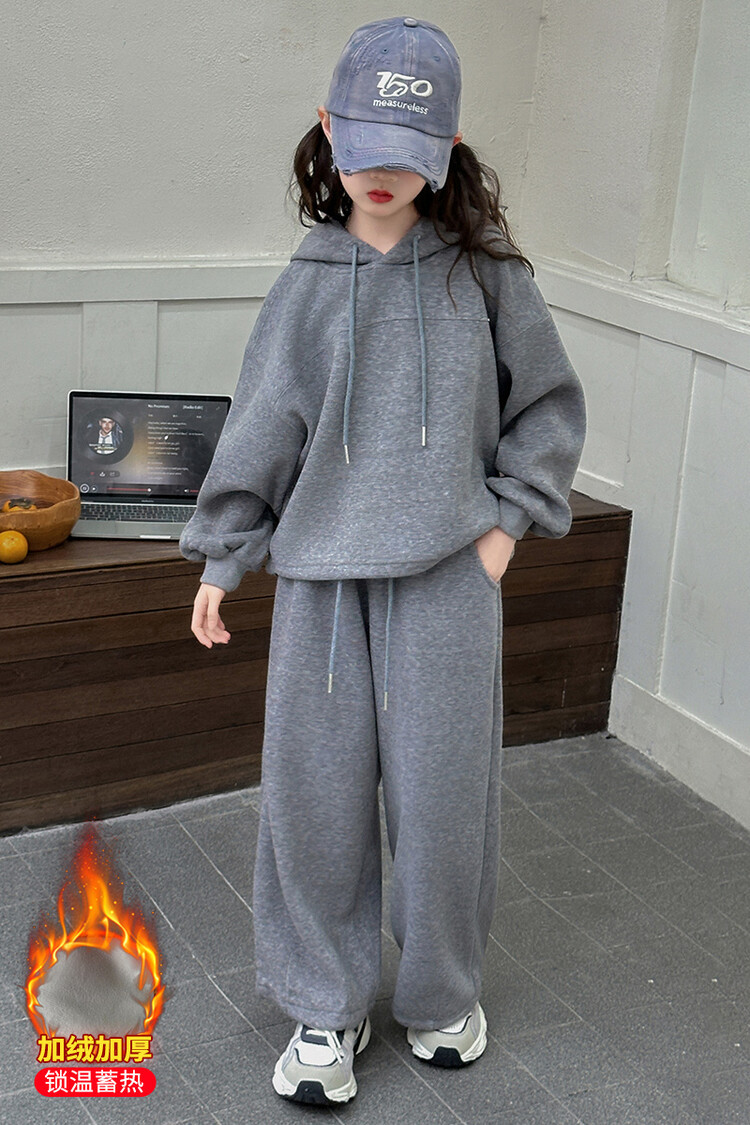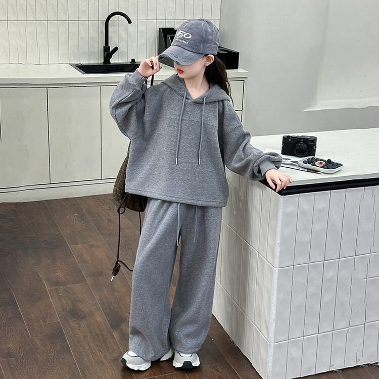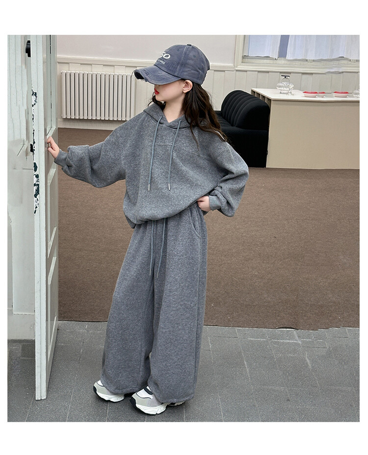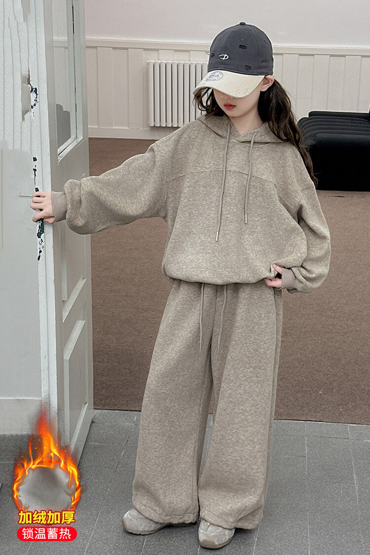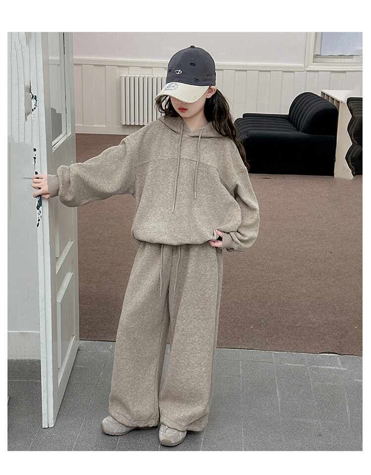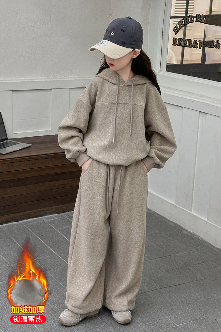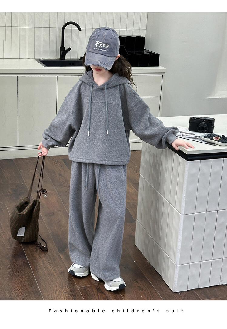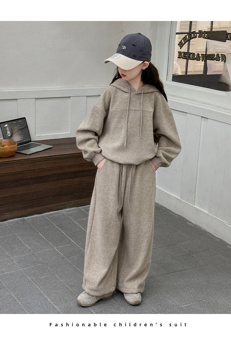 소녀의 캐주얼 양털 세트 후드 스웨트 와이드 레그 팬츠 가을과 겨울 큰 소녀의 유행 스포츠 투피스 유행 세트