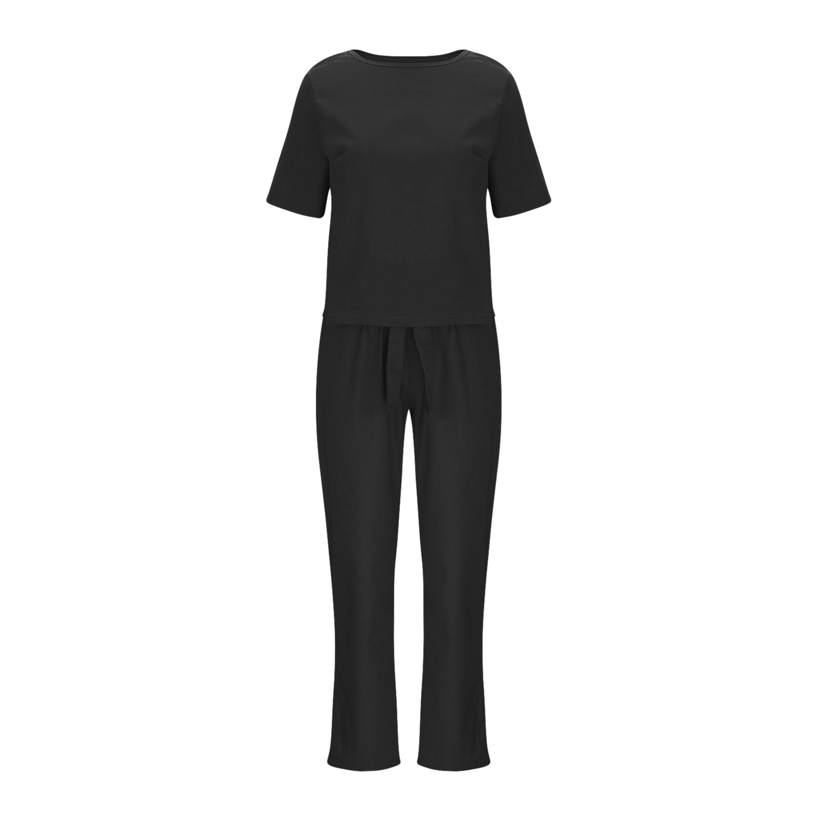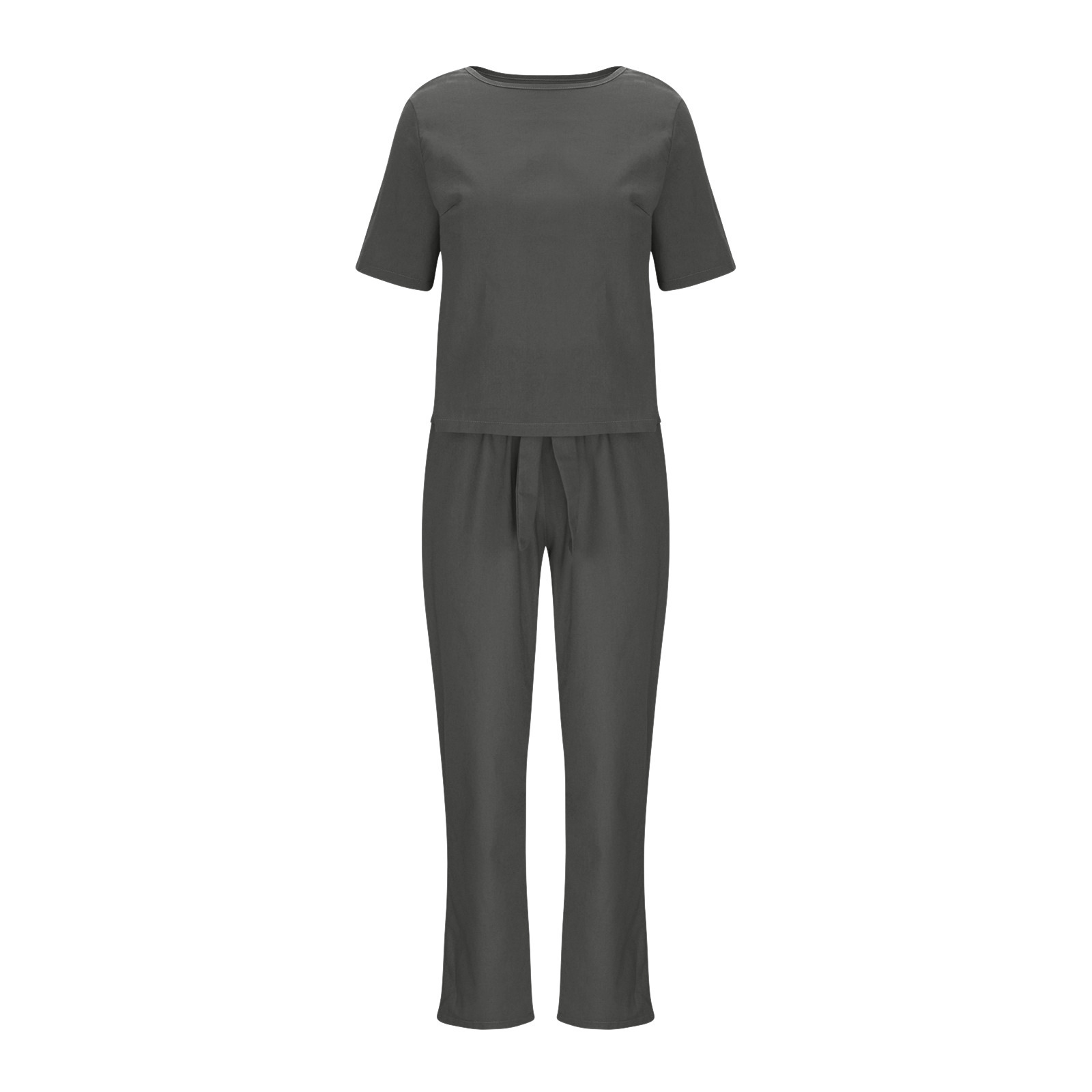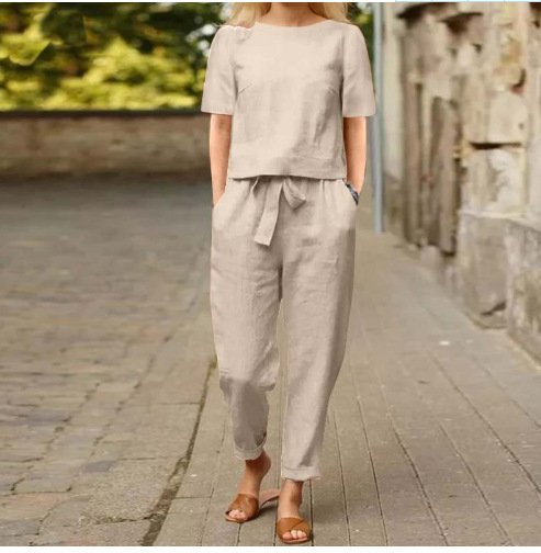 국경을 넘나 드는 유럽과 미국의 여성면 및 린넨 여름 세트 반 소매 O 칼라 슈퍼 대형 블라우스 e 넓은 다리 바지 복고풍 세트 홈 의류스토어 가기