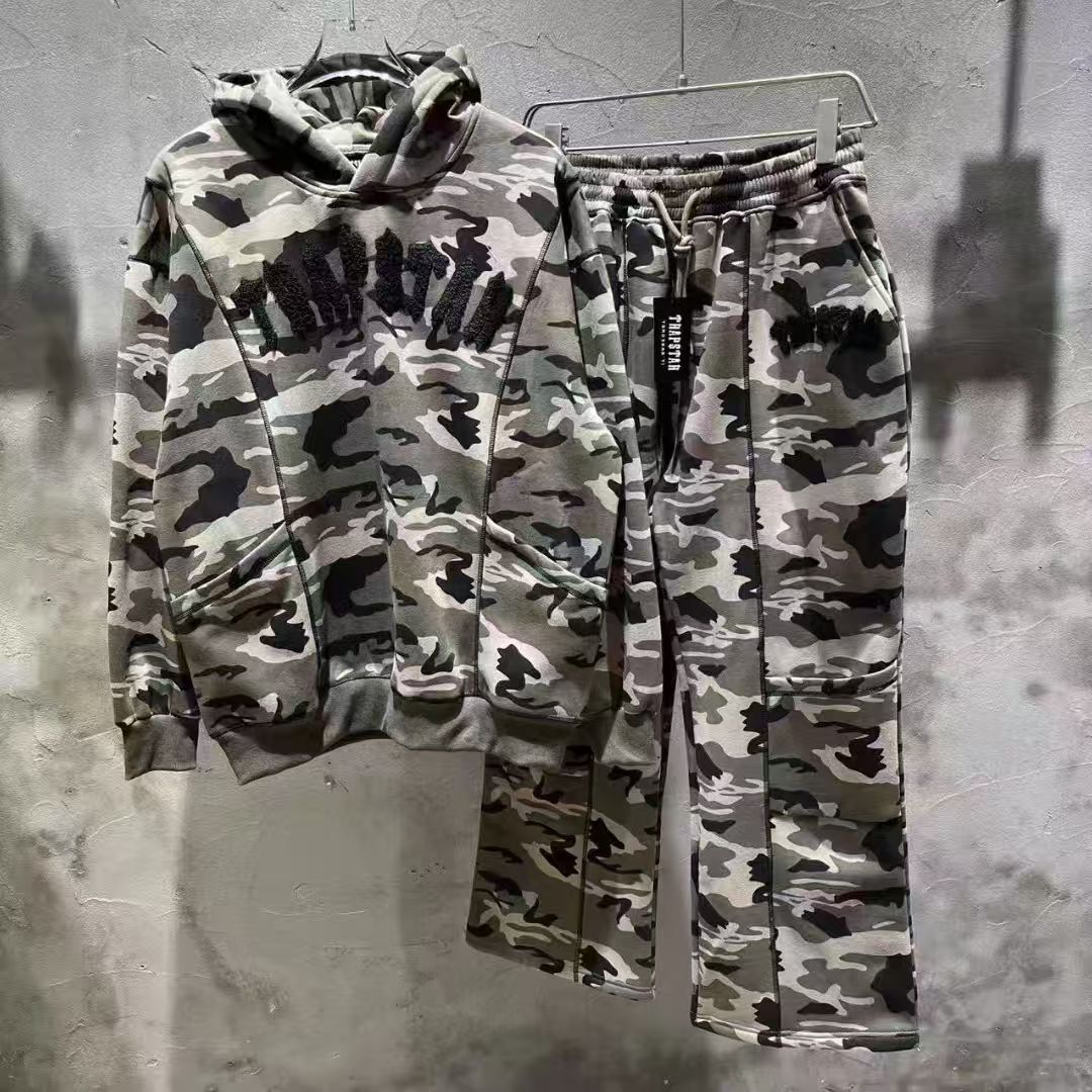 광주 도매 Trapstar 그라디언트 편지 위장 수건 자수 기모 후드 스웨터 바지 캐주얼 세트