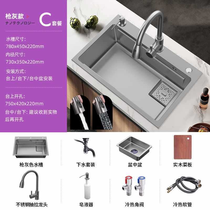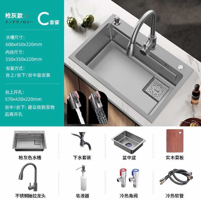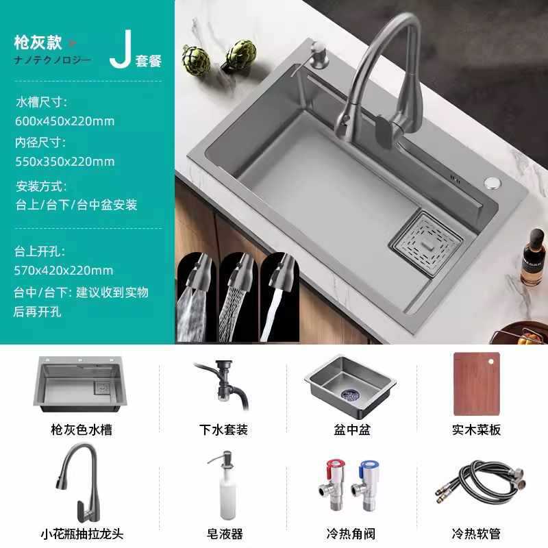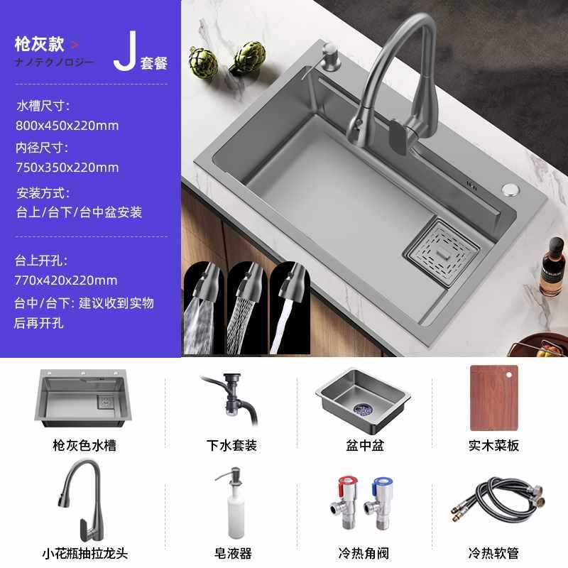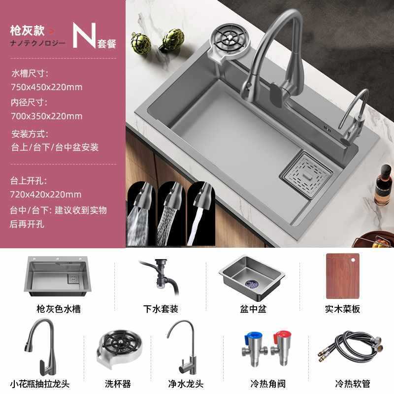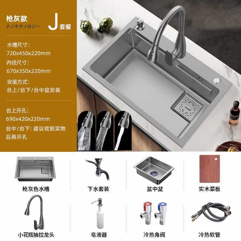 총 회색 SUS304 스테인레스 스틸 나노 주방 싱크 손 비행 비 큰 단일 싱크 폭포 야채 싱크 싱크