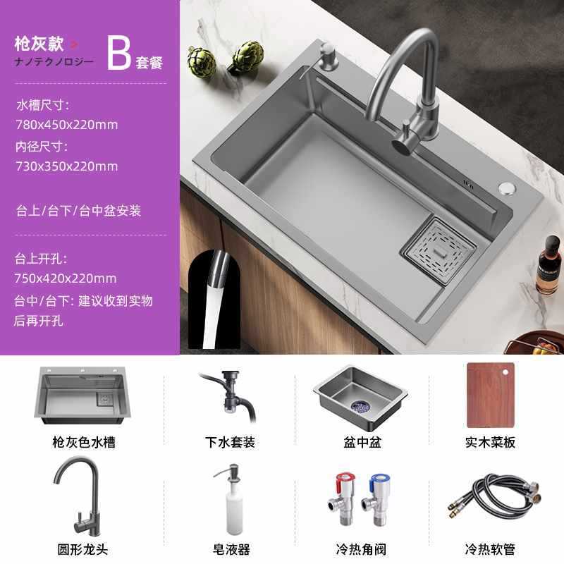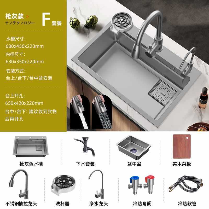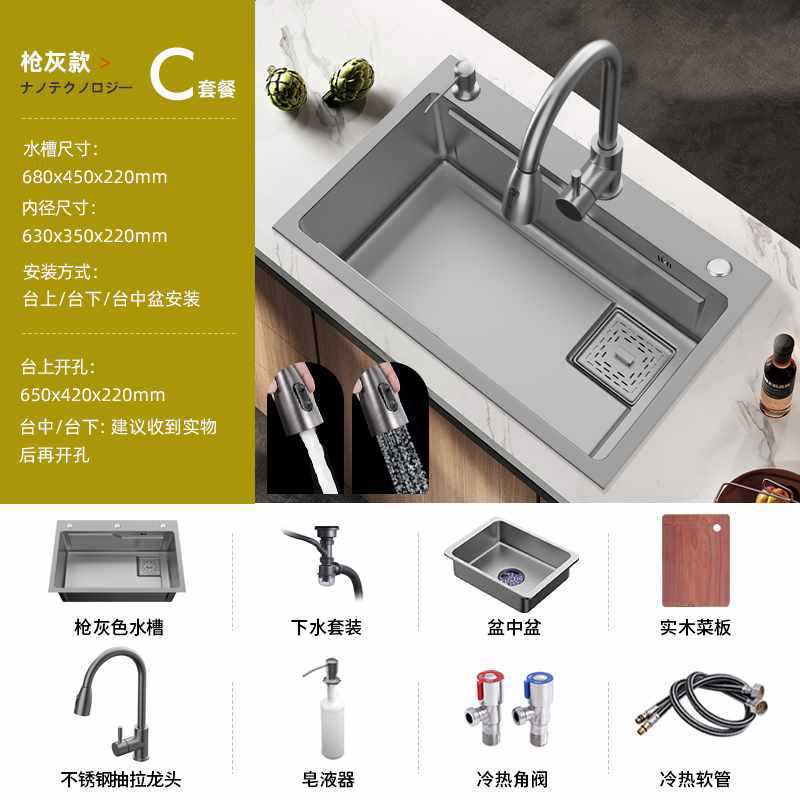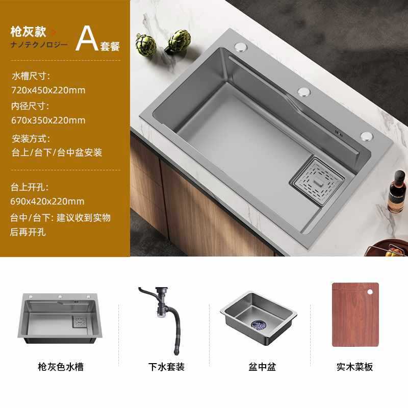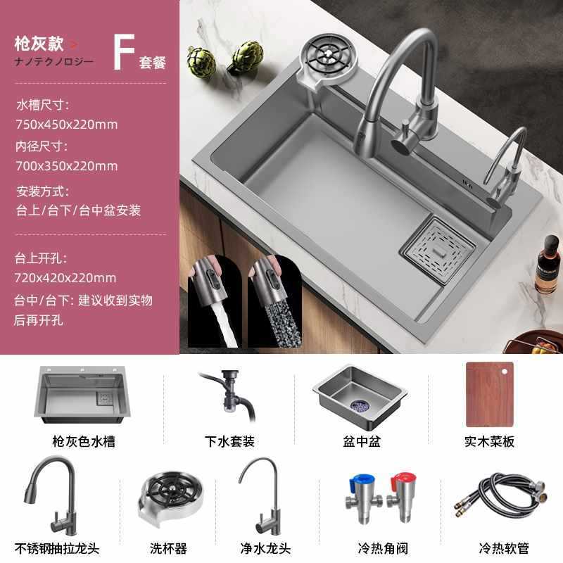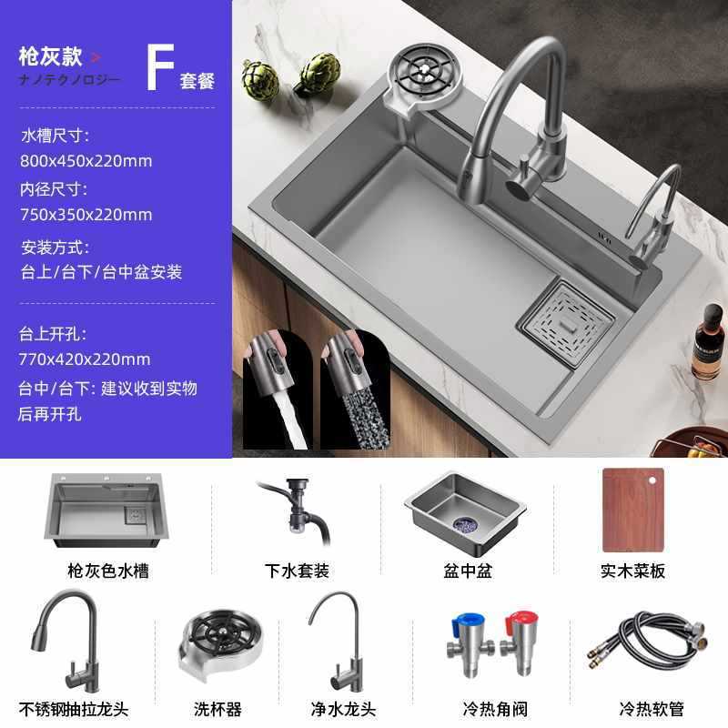 총 회색 SUS304 스테인레스 스틸 나노 주방 싱크 손 비행 비 큰 단일 싱크 폭포 야채 싱크 싱크