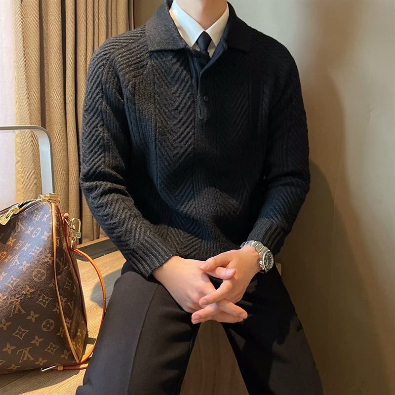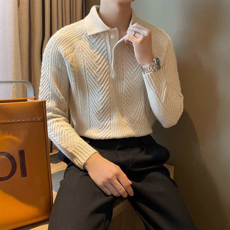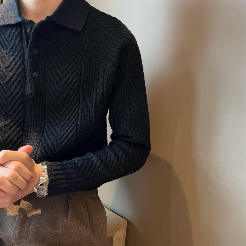 빈티지 두꺼운 따뜻한 자카드 질감 레이저 스웨터 솔리드 컬러 남성 캐주얼 어깨 풀오버 니트 폴로 셔츠