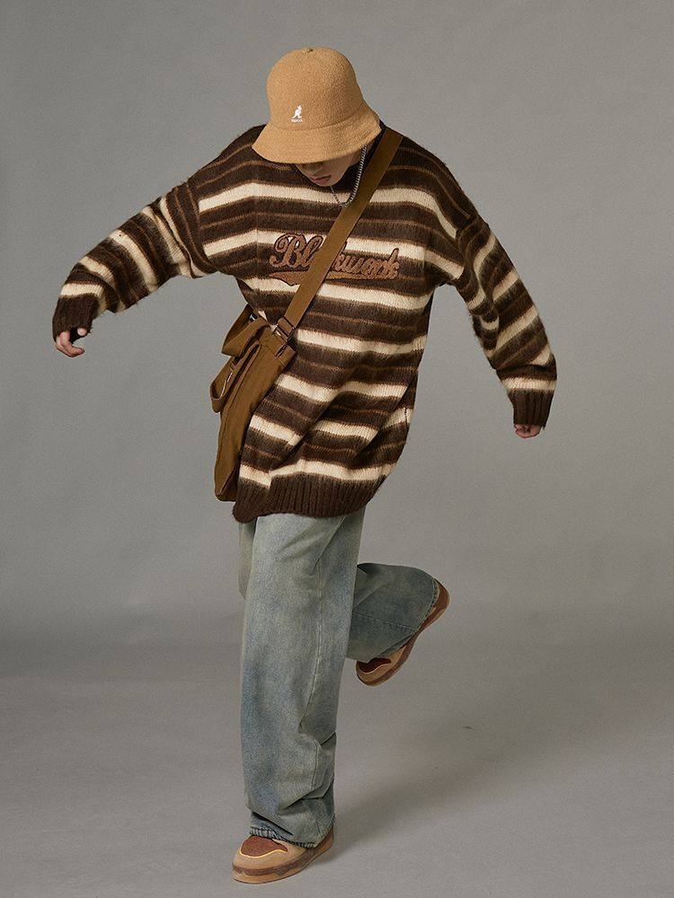 아메리칸 스타일 레트로 스트라이프 라운드 넥 루즈 스웨터 남성과 여성의 오버 사이즈 간단한 니트 셔츠 탑 커플의 세련된 재킷스토어 가기