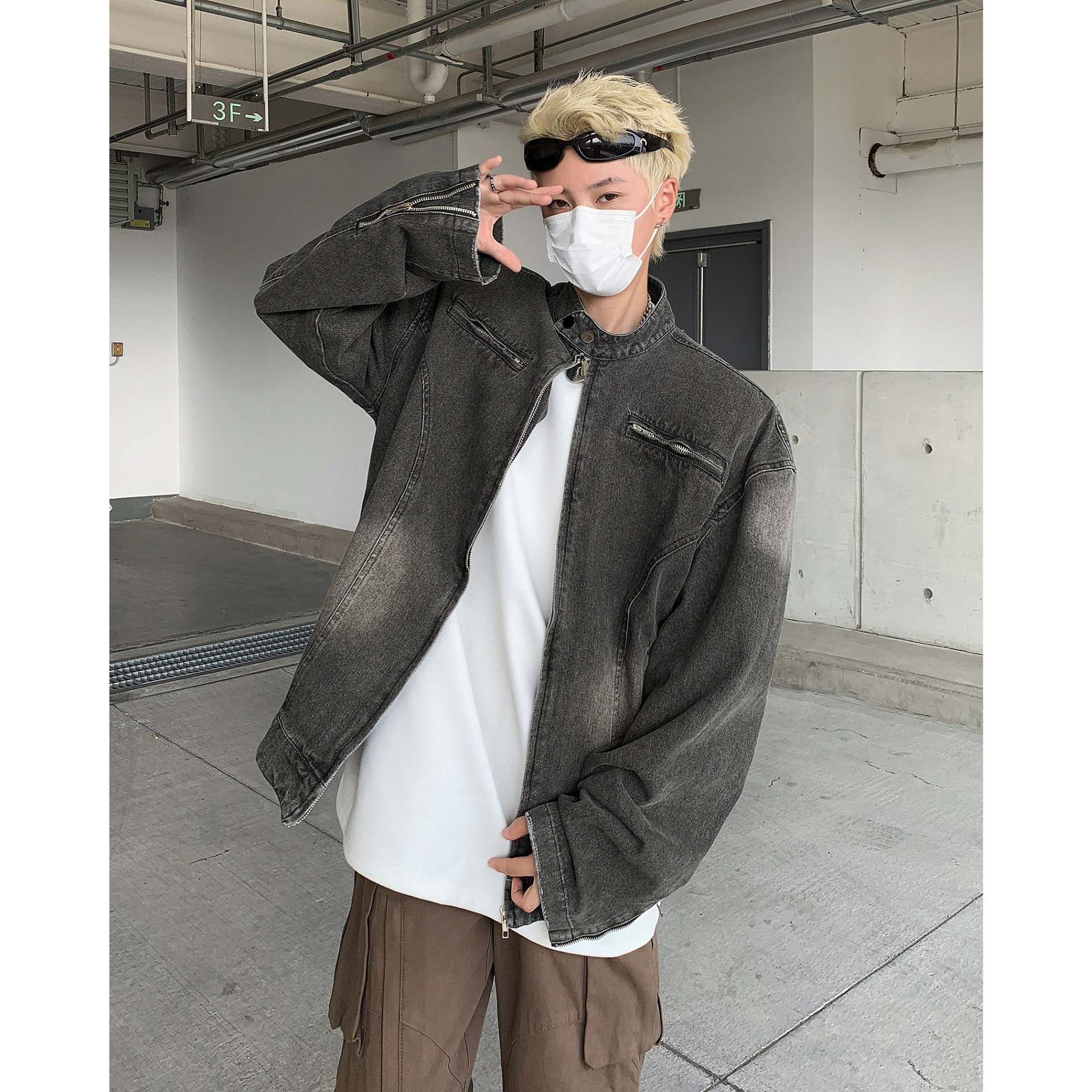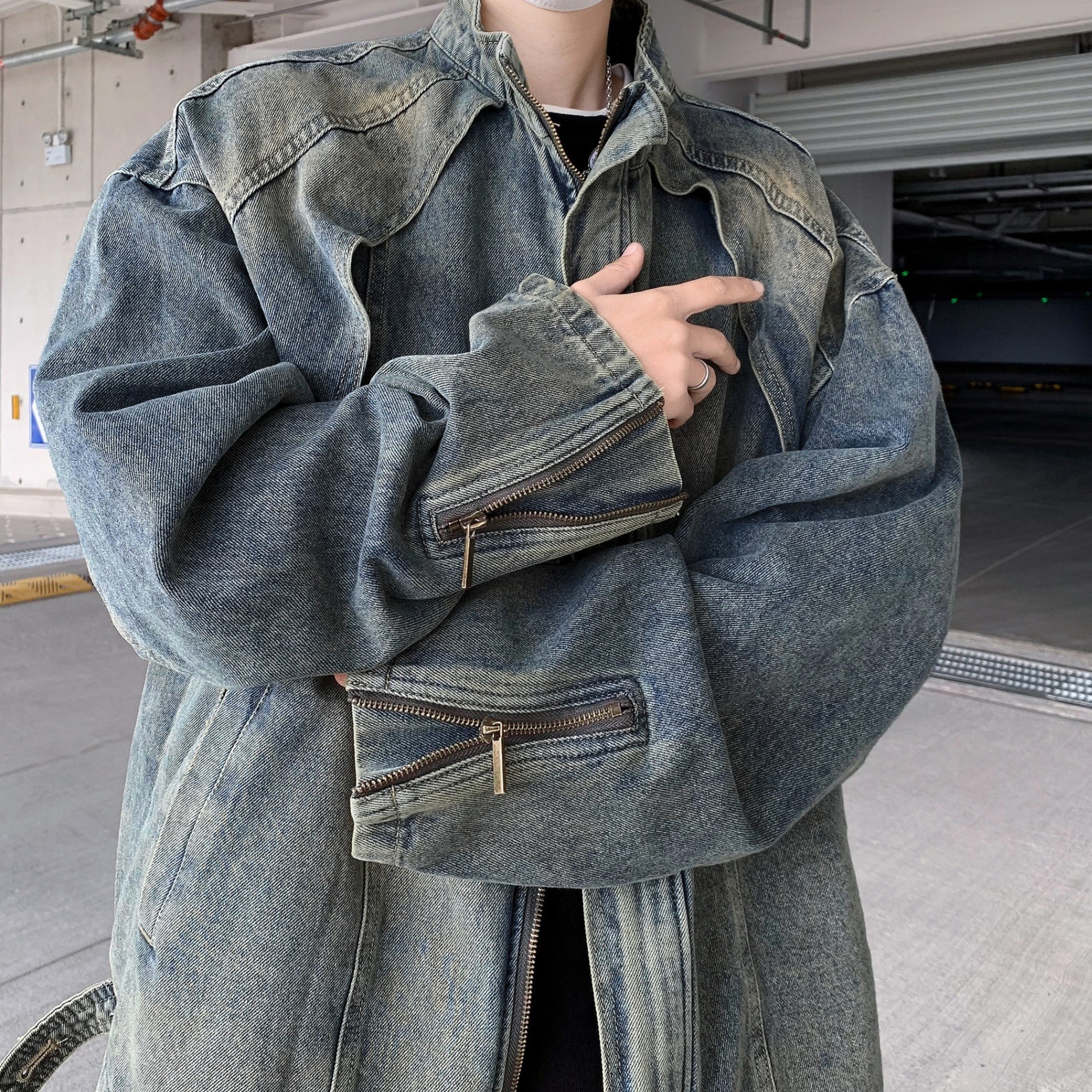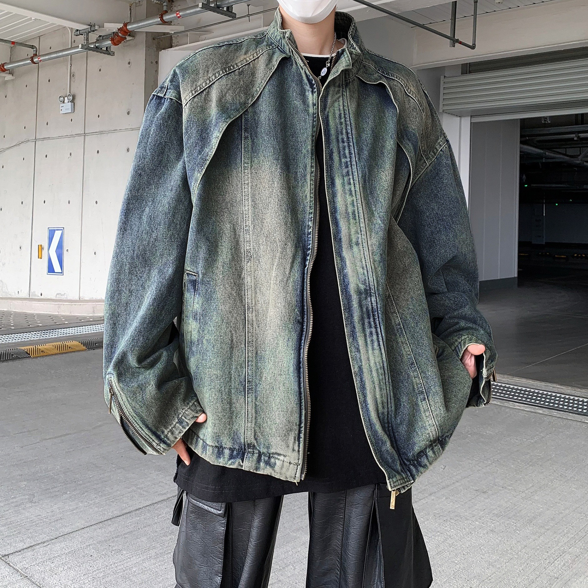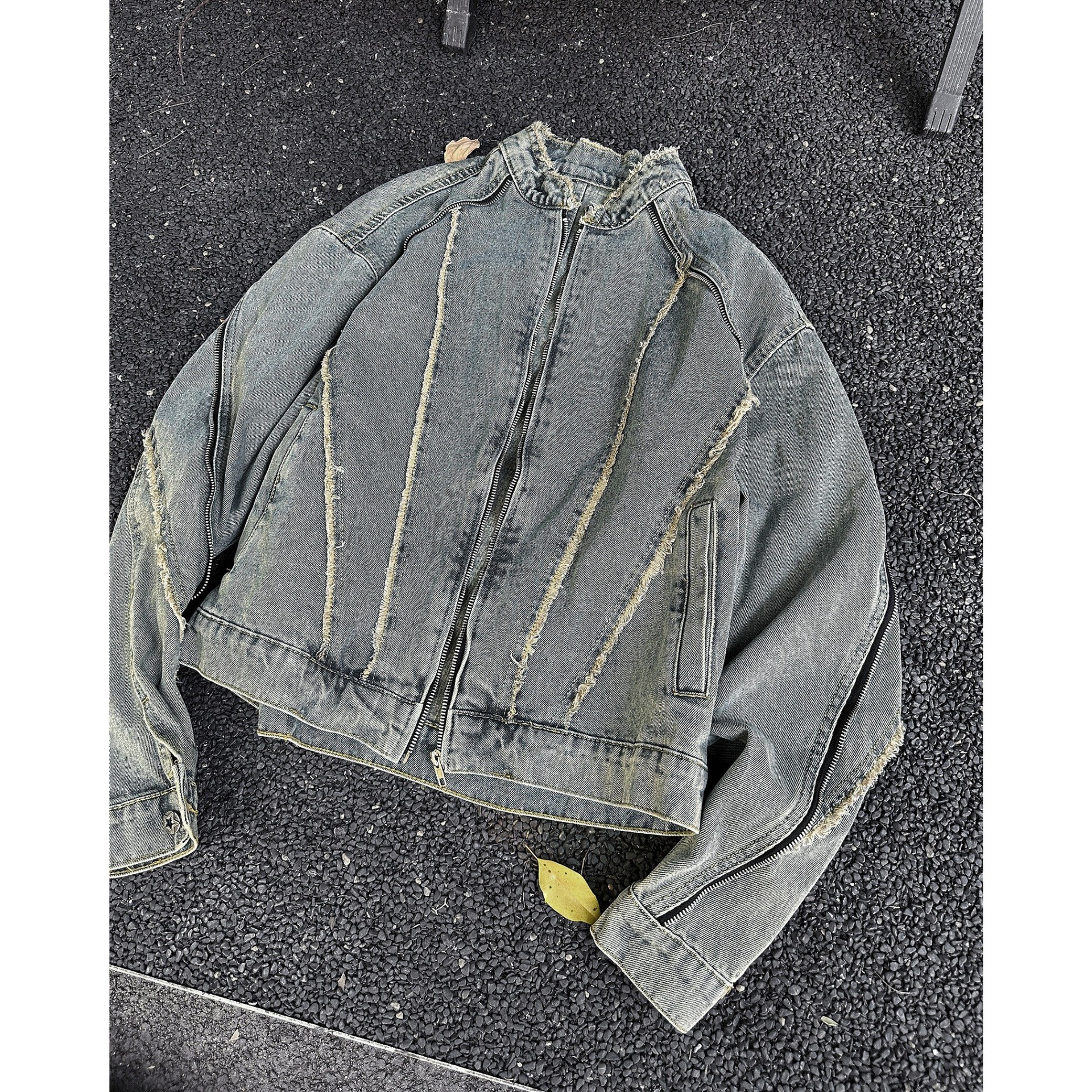 아메리칸 스타일 빈티지 해체 러플 세탁 데님 재킷 남성 봄과 가을 짧은 오토바이 스타일 스탠드 칼라 핸즈섬 재킷 트렌디스토어 가기