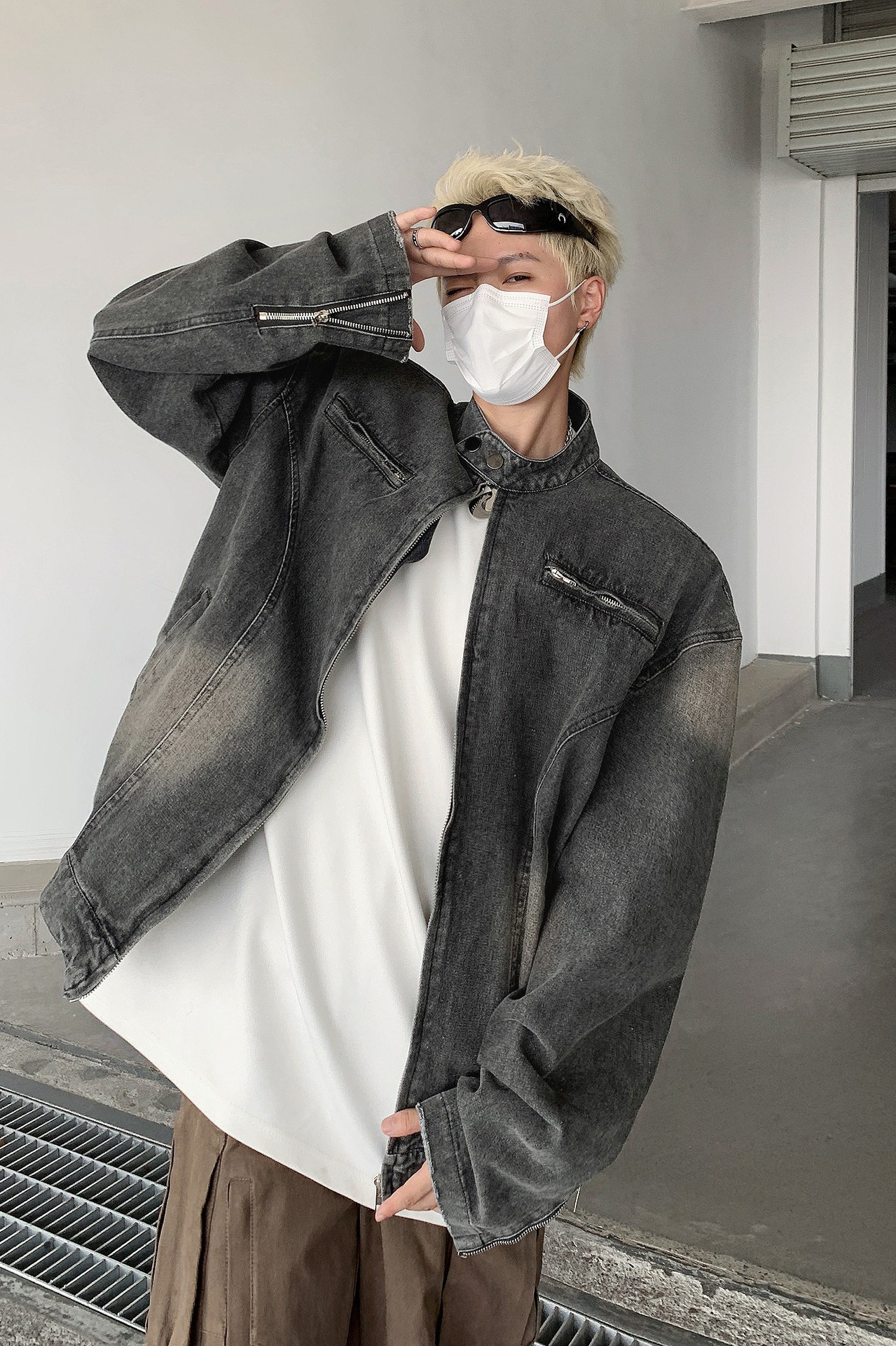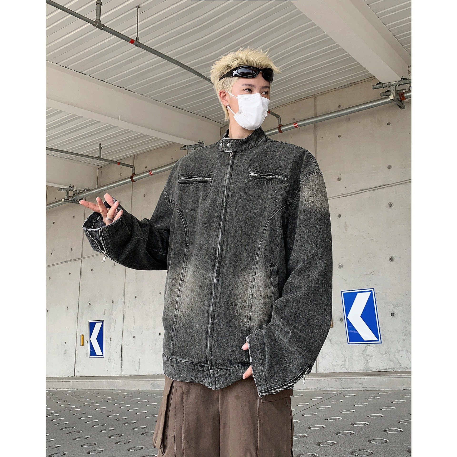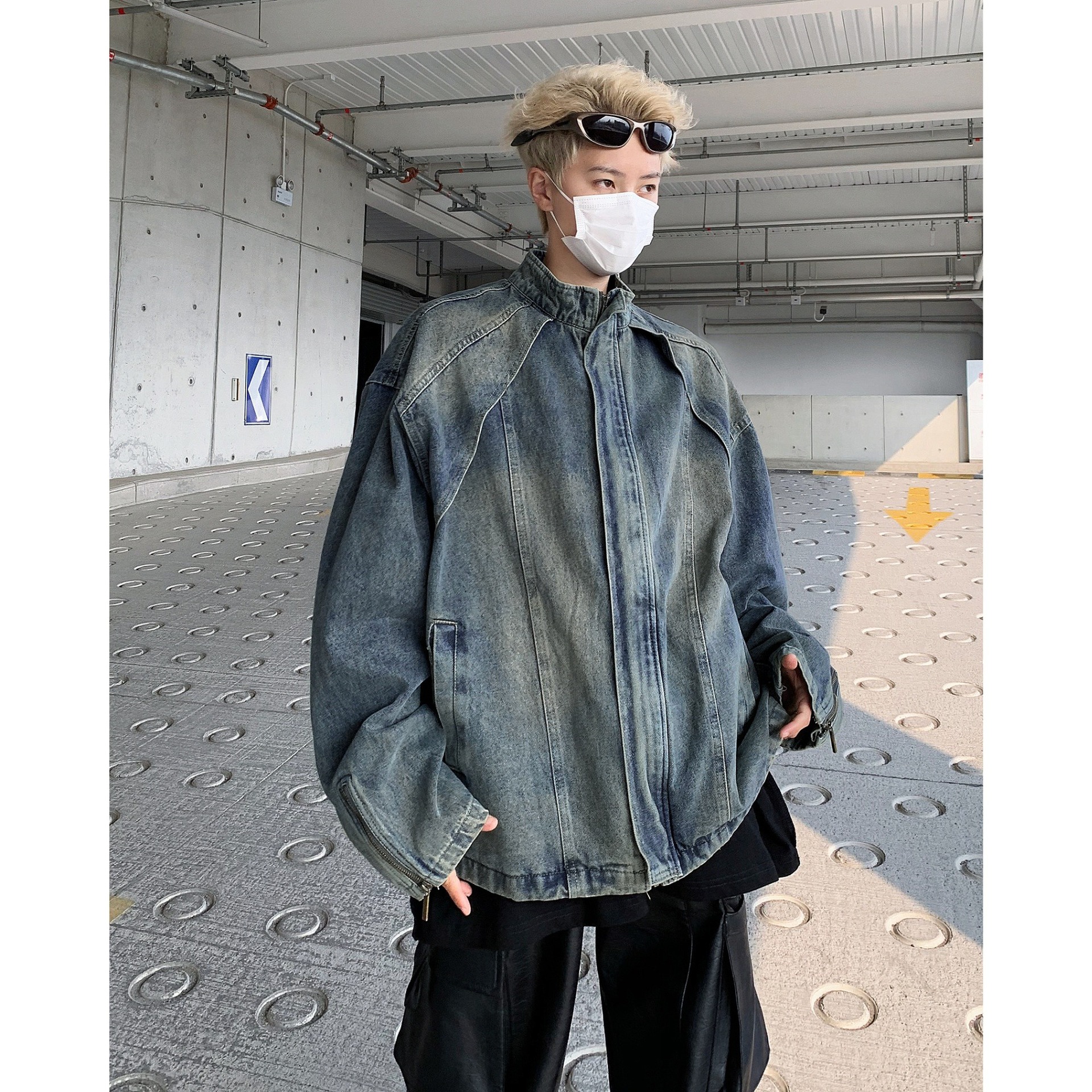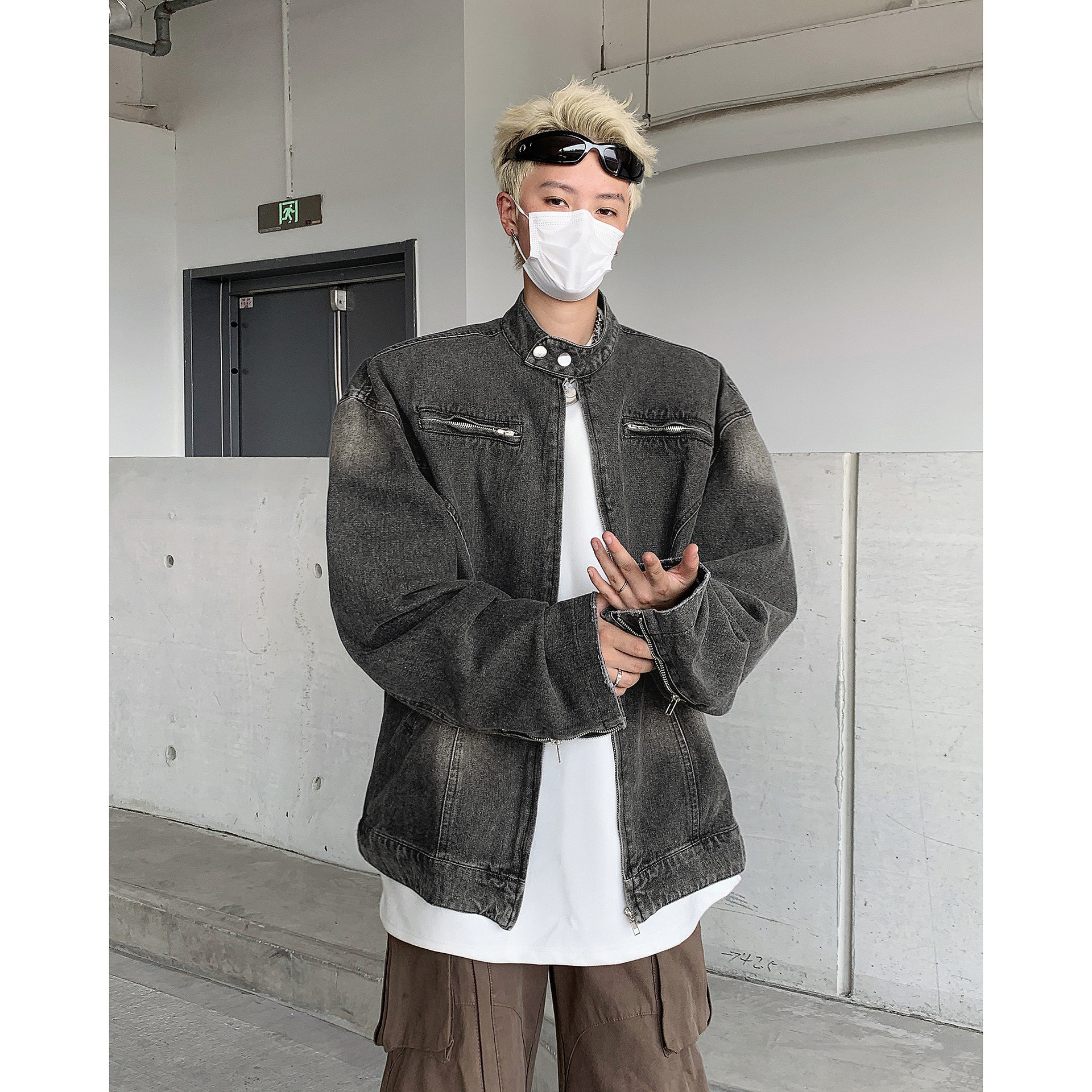 아메리칸 스타일 빈티지 해체 러플 세탁 데님 재킷 남성 봄과 가을 짧은 오토바이 스타일 스탠드 칼라 핸즈섬 재킷 트렌디스토어 가기