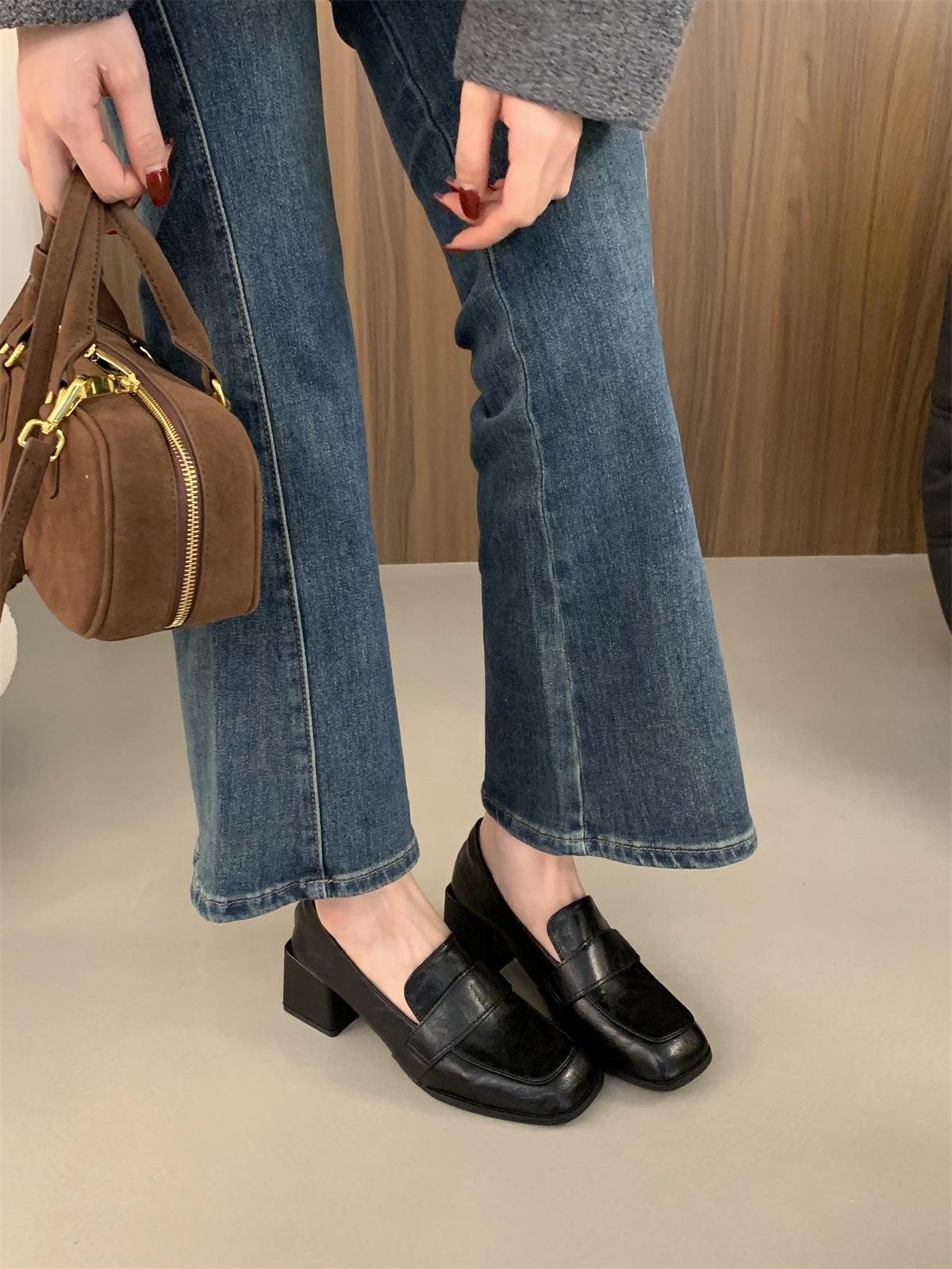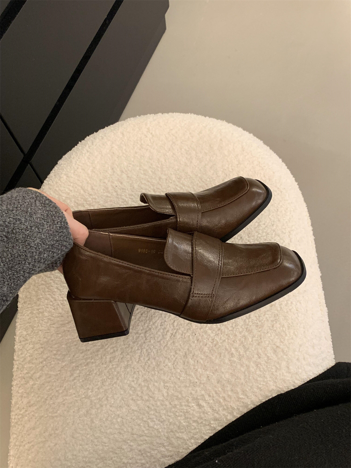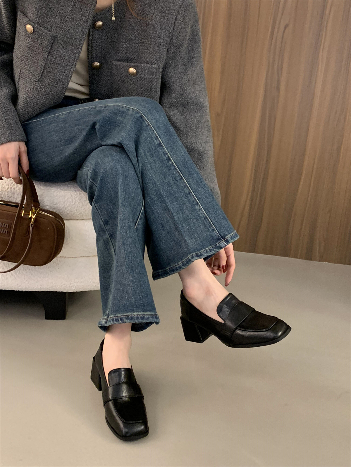 블랙 로퍼 스퀘어 토 게으른 슬립 온 두꺼운 하이힐 가죽 신발 올 매치 프랑스 메리 제인 싱글 레이어 신발 여성용 미들스토어 가기
