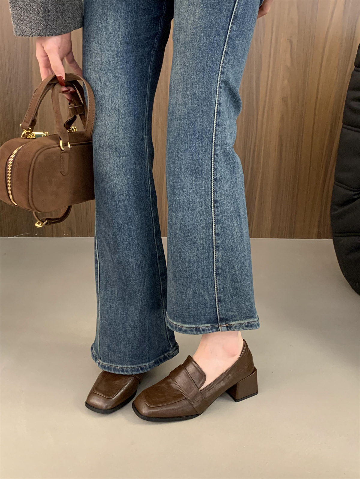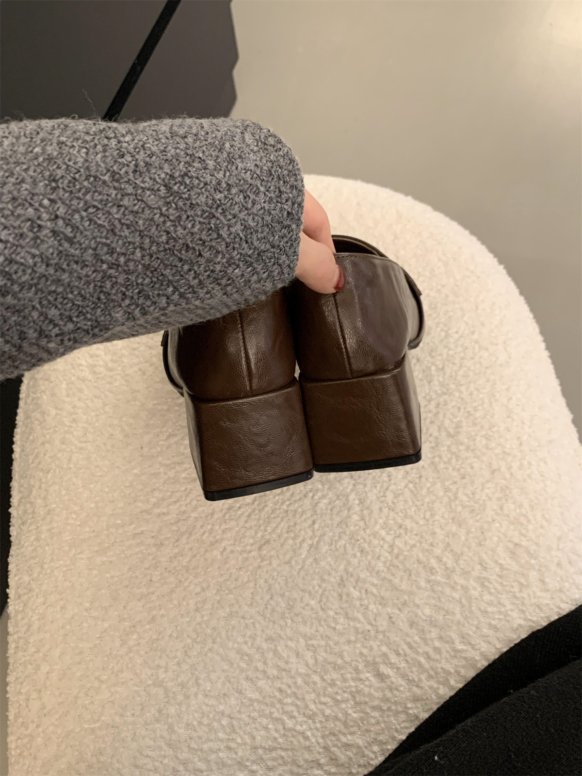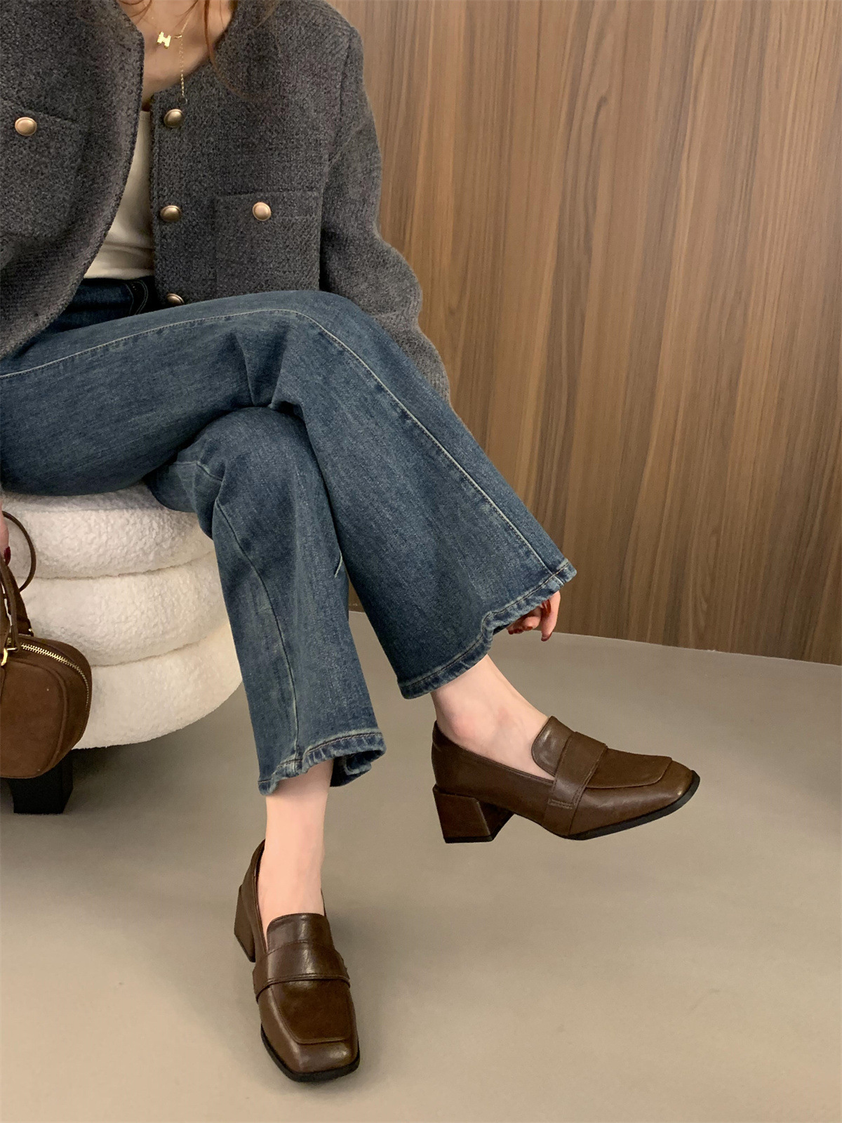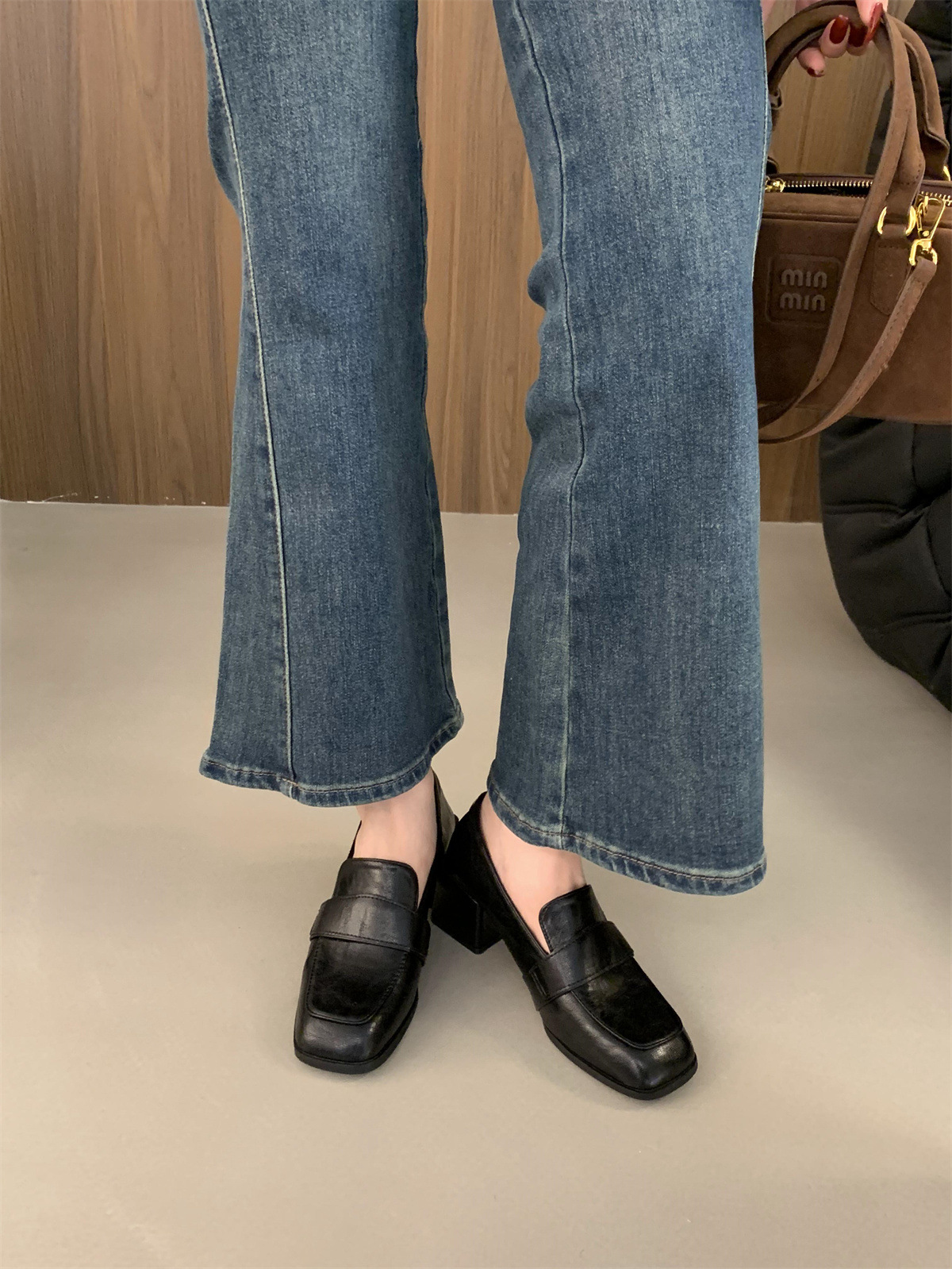 블랙 로퍼 스퀘어 토 게으른 슬립 온 두꺼운 하이힐 가죽 신발 올 매치 프랑스 메리 제인 싱글 레이어 신발 여성용 미들스토어 가기