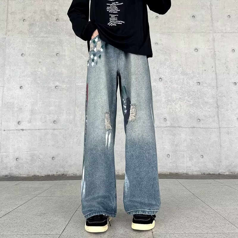 트렌디 한 남성 유럽과 미국의 하이 스트리트 청바지 홍콩 스타일 복고풍 인쇄 낙서 바지 내 한국식 느슨한 와이드 레그 스트레이트 바지스토어 가기