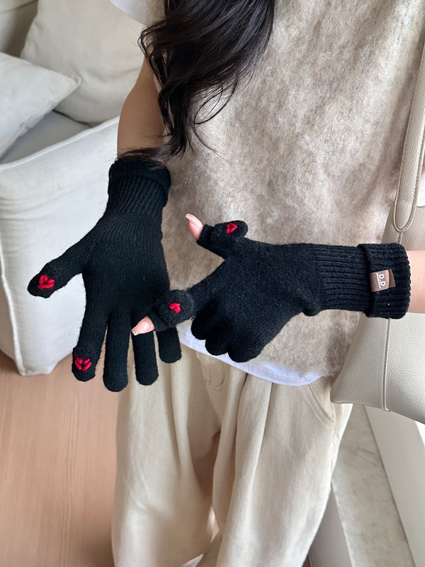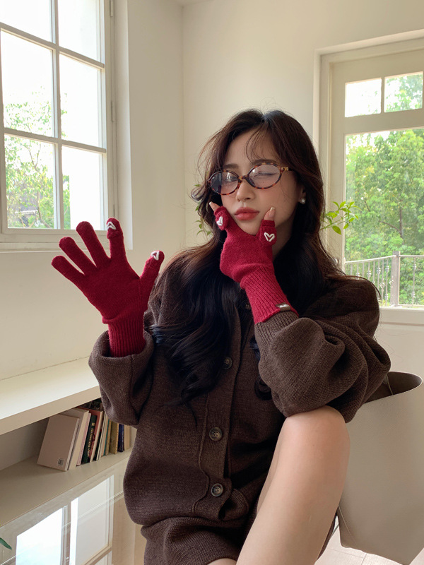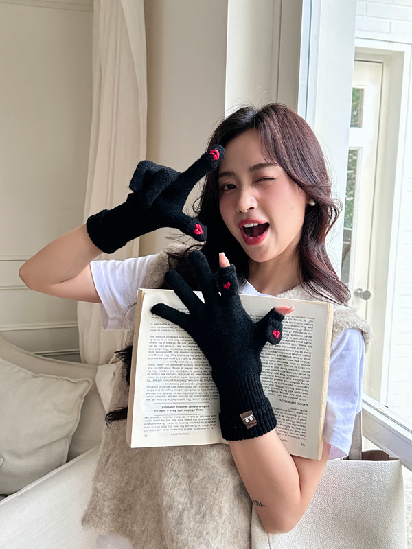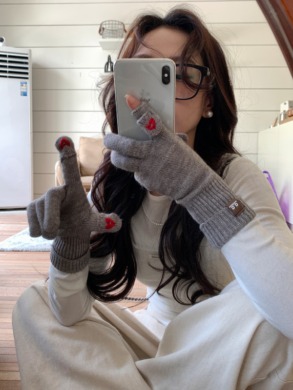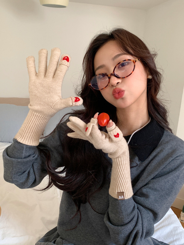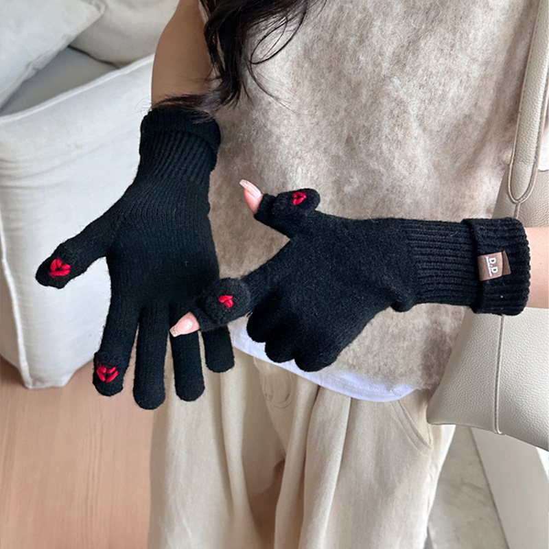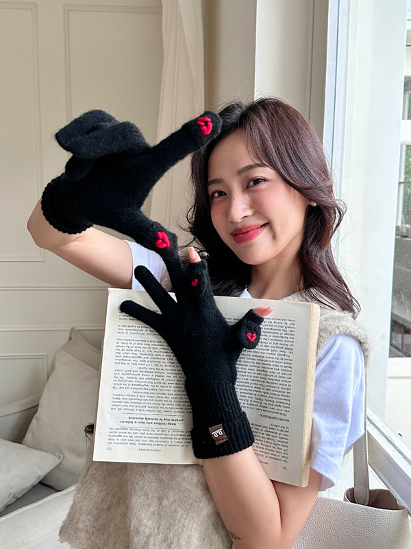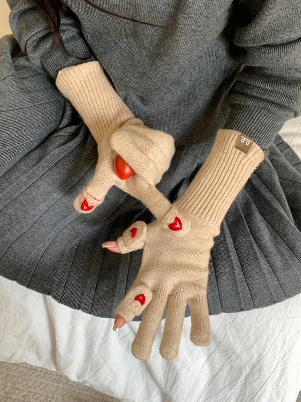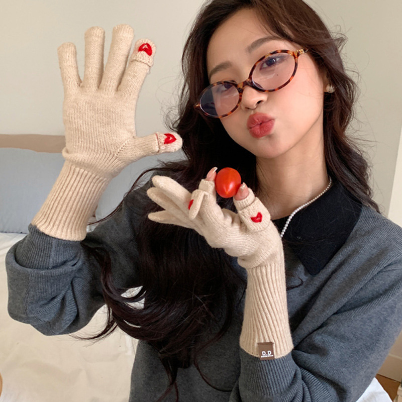 2024 가을과 겨울 양모 니트 사랑 자수 장갑 여성 양모 오픈 손가락 터치 스크린 따뜻한 승마 학생 감기 보호