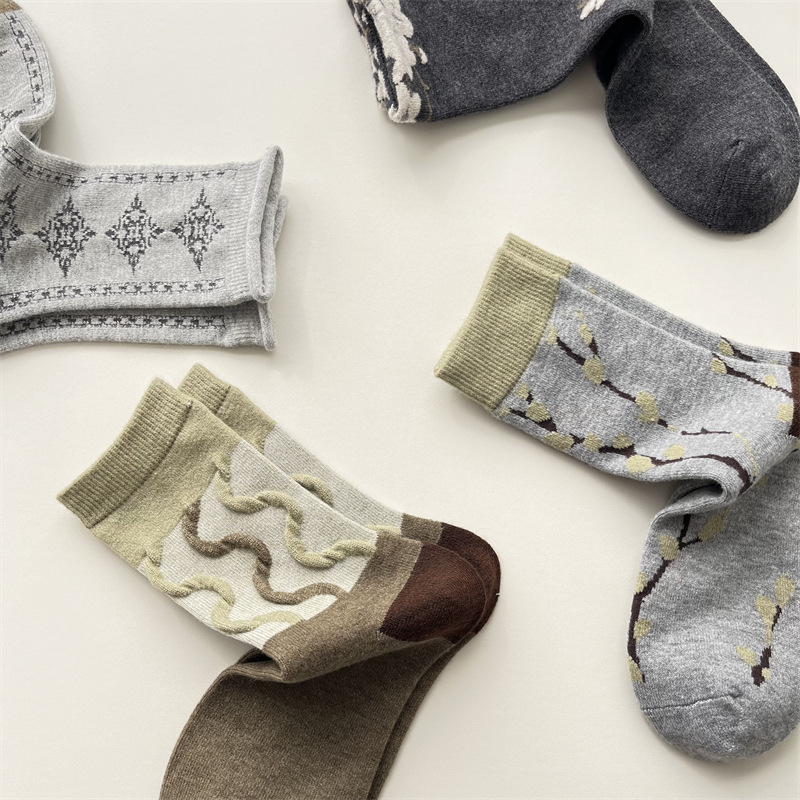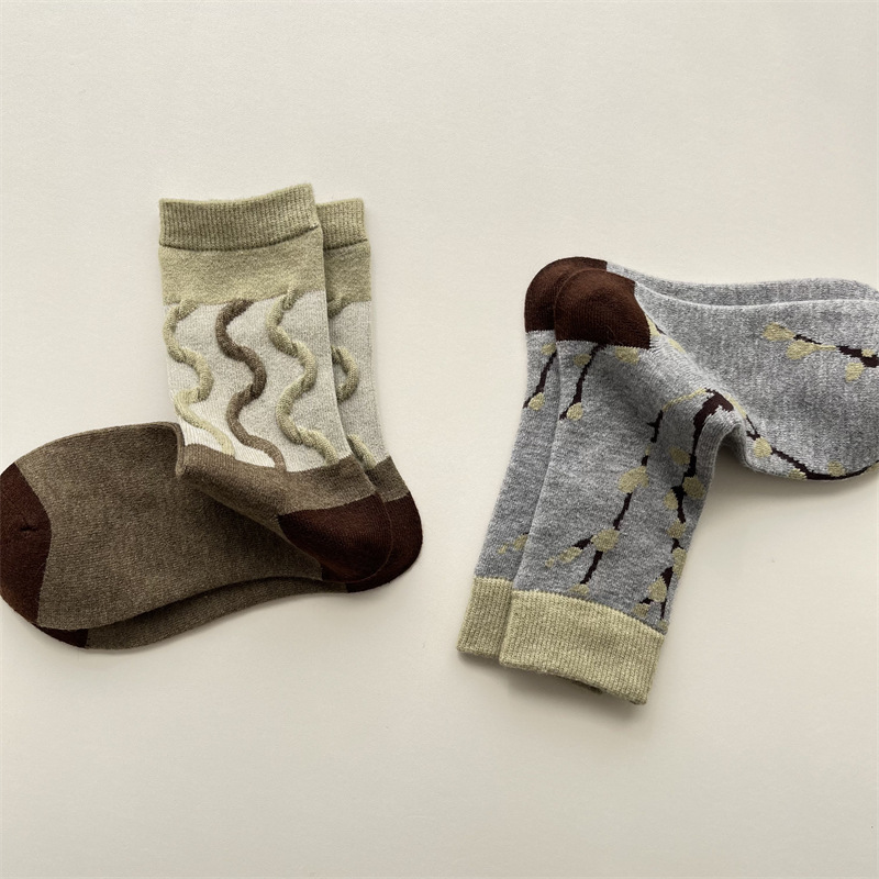 가을과 겨울 궁전 스타일 꽃 양모 미드 튜브 양말 일본식 복고풍 곡선 다이아몬드 스타킹 여성용 입체 라인 양말