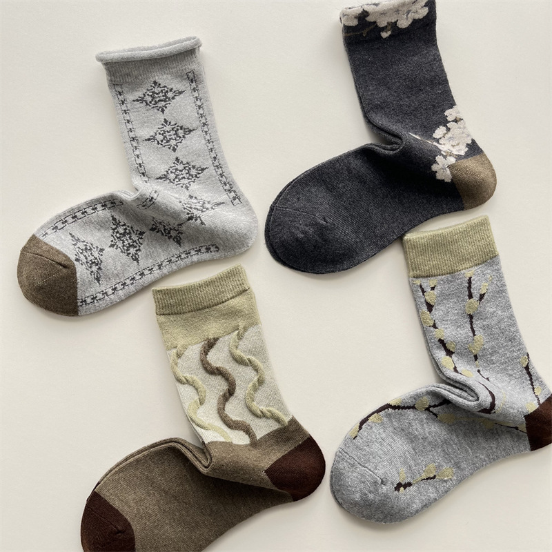 가을과 겨울 궁전 스타일 꽃 양모 미드 튜브 양말 일본식 복고풍 곡선 다이아몬드 스타킹 여성용 입체 라인 양말스토어 가기