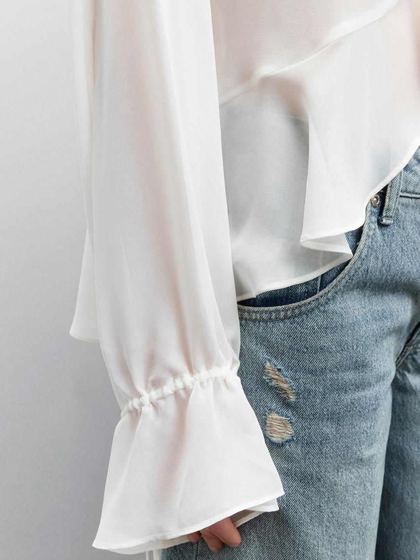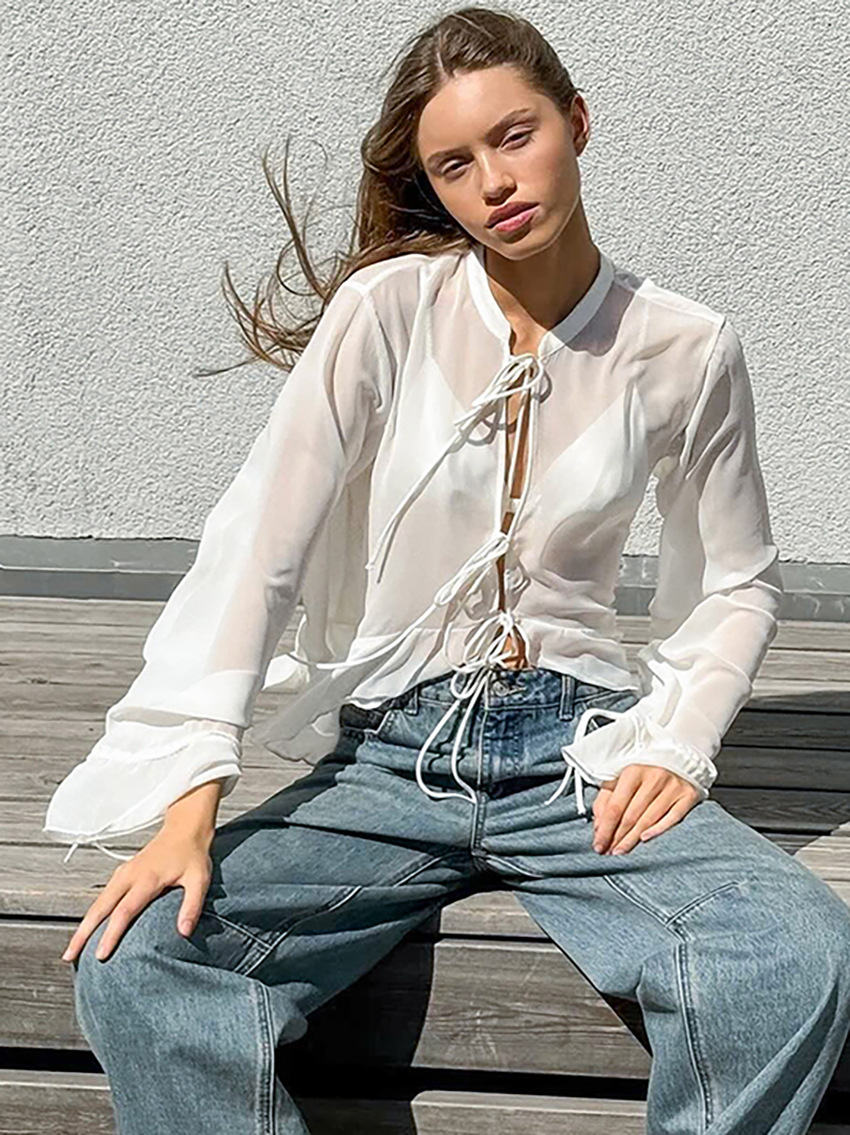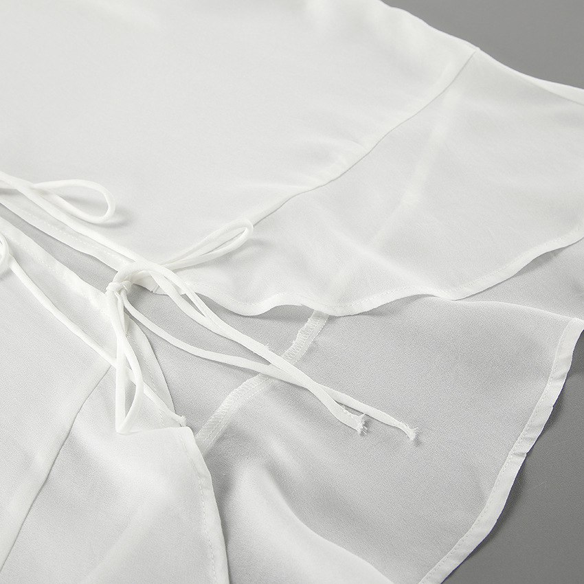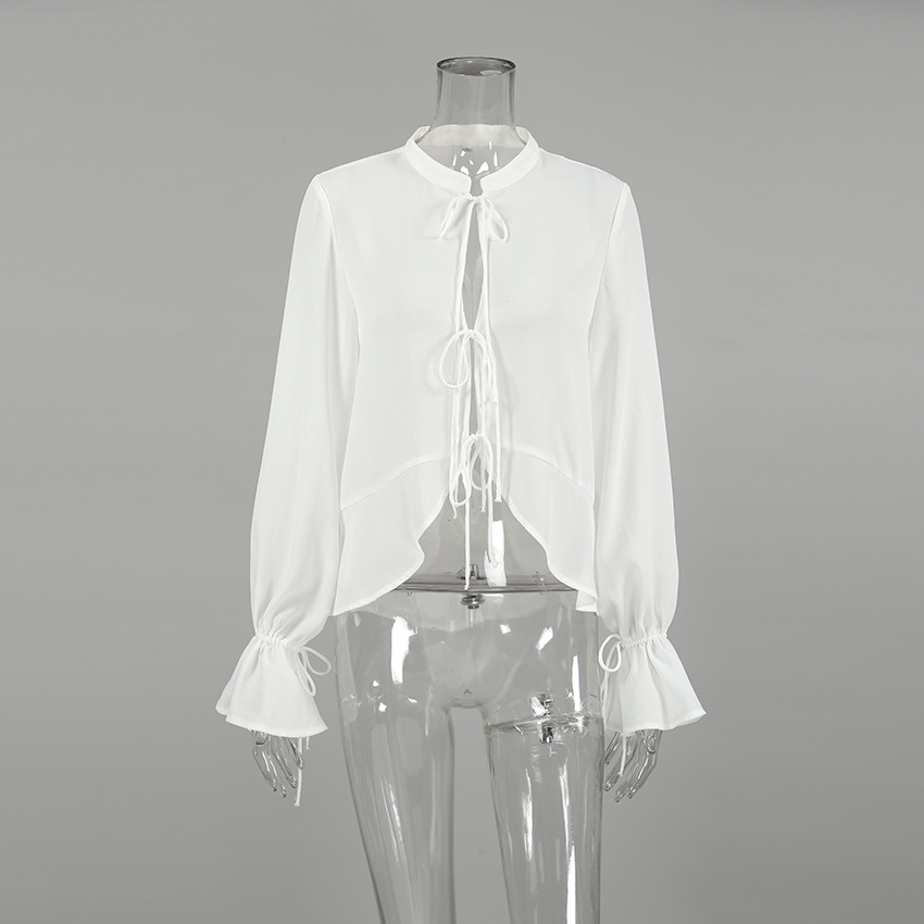 유럽과 미국의 고급스러운 느낌을 주는 러플 레이스업 화이트 쉬폰 셔츠 2025 봄 여름 신상 크로스보더 니치 시스루 탑
