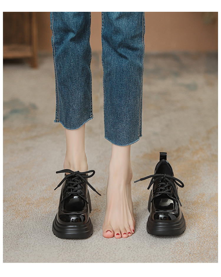 내부 키높이 여성용 가죽 신발 2025 봄 신상 플랫폼 슈즈 두꺼운 밑창 로퍼 두꺼운 굽 끈 묶는 8.5CM 단화