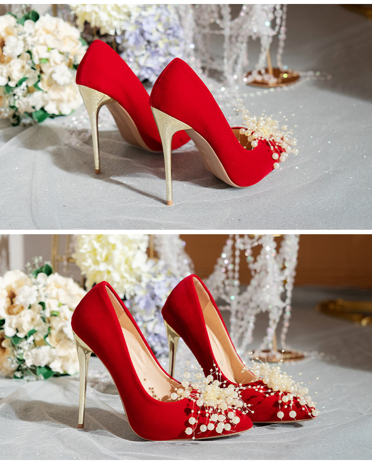 10CM 하이힐 여성의 뾰족한 얕은 스틸레토 힐 45 플러스 사이즈 싱글 슈즈 여성 펄 패션 슈즈 신부 웨딩 슈즈 여성