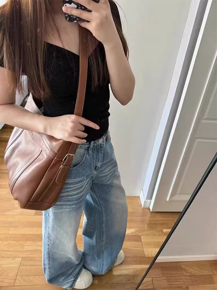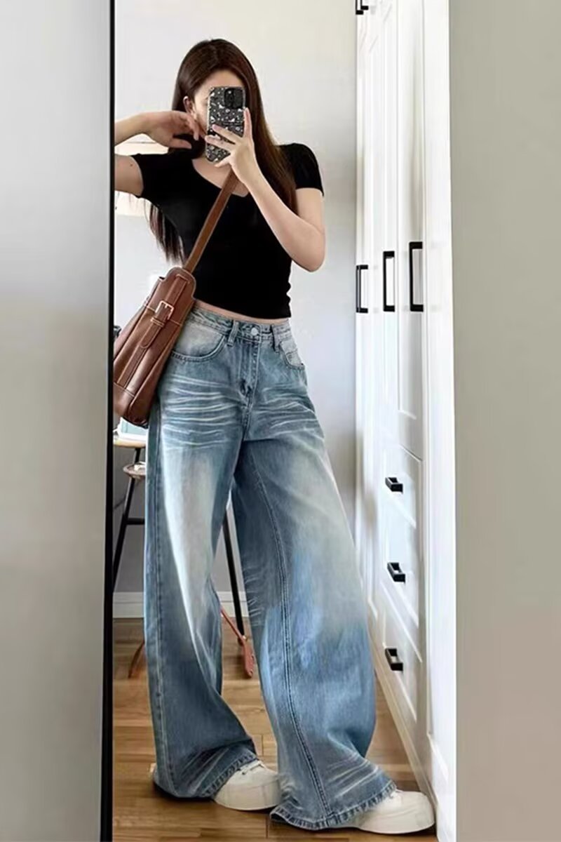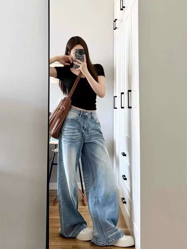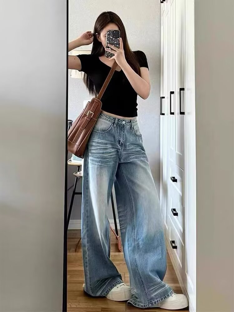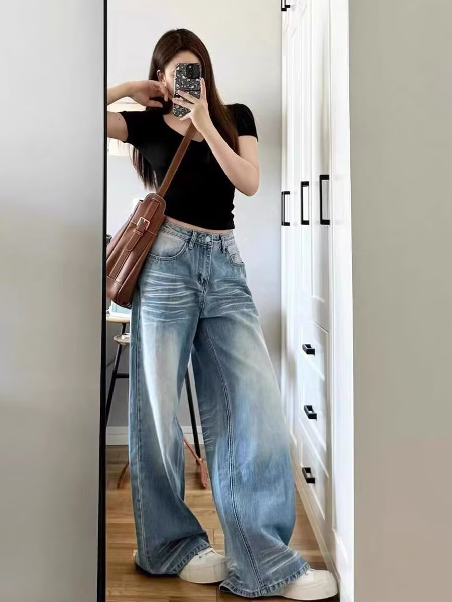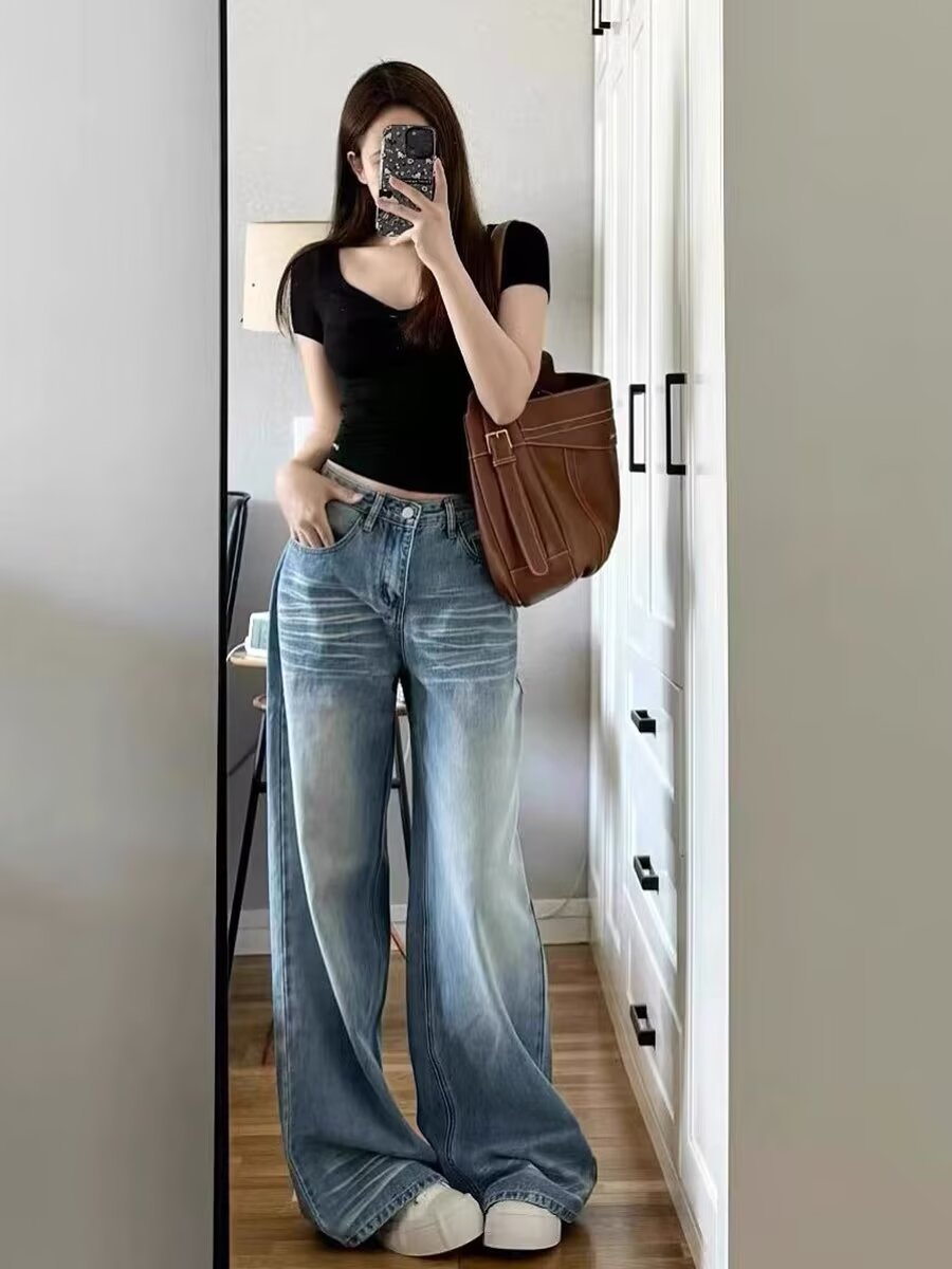 아메리칸 스타일 레트로 와이드 레그 청바지 여성의 2024 년 여름 새로운 물 세척 블루 루즈 슬리밍 스트레이트 팬츠