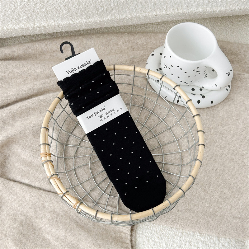 한국식 뼈없는 양모 스태킹 양말 여성용 가을 겨울 단색 작은 레이스 웨이브 도트 두꺼운 따뜻한 양말 여성용 미드 튜브 양말스토어 가기