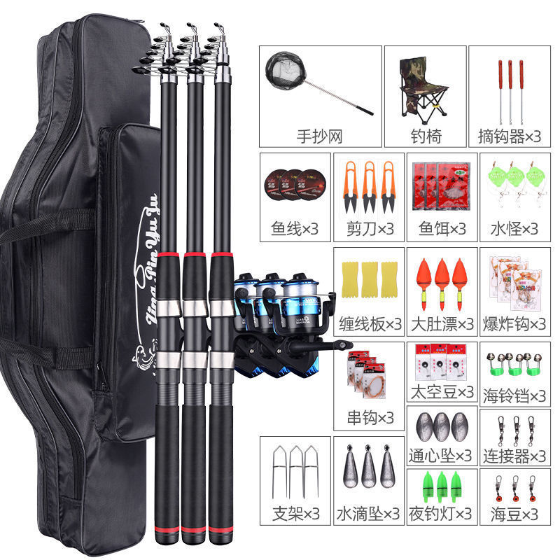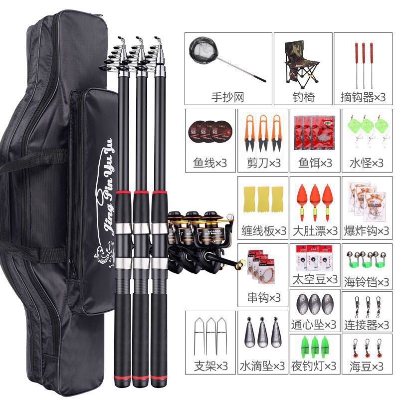 • [낚싯대 3세트] + 선물가방 + 낚싯대가방 + 낚시스툴 + 복사망 - 2.4m +14축 7000【