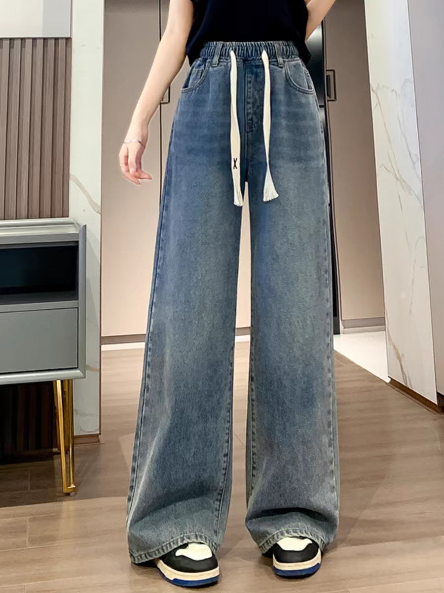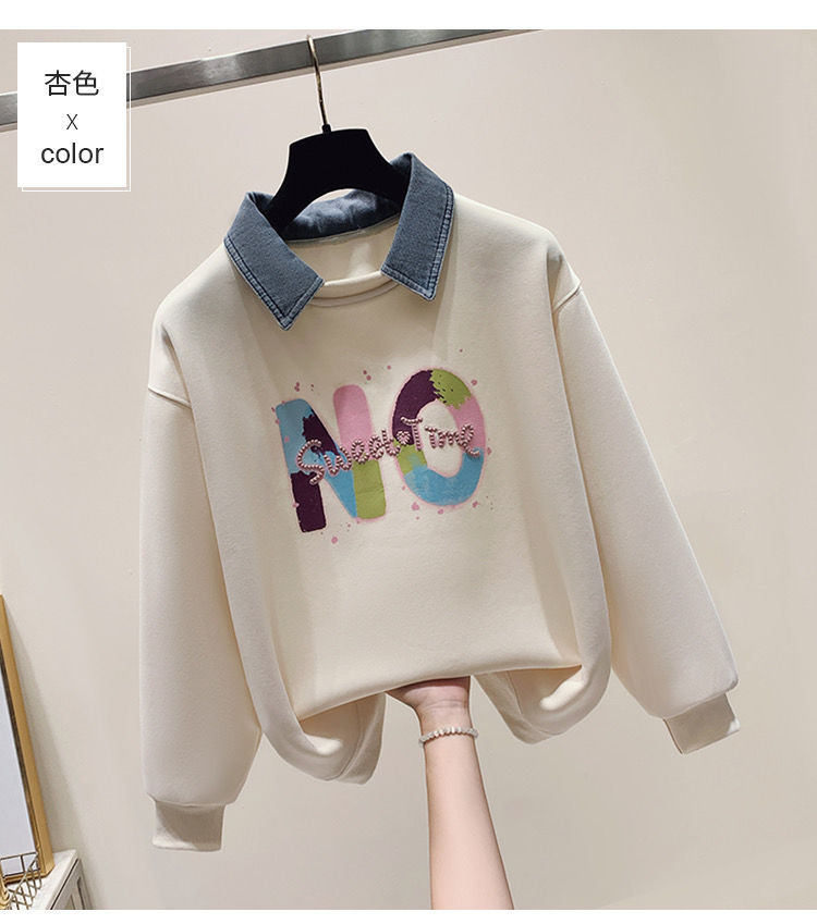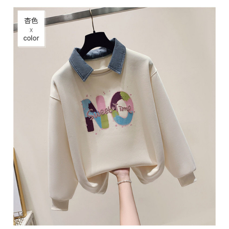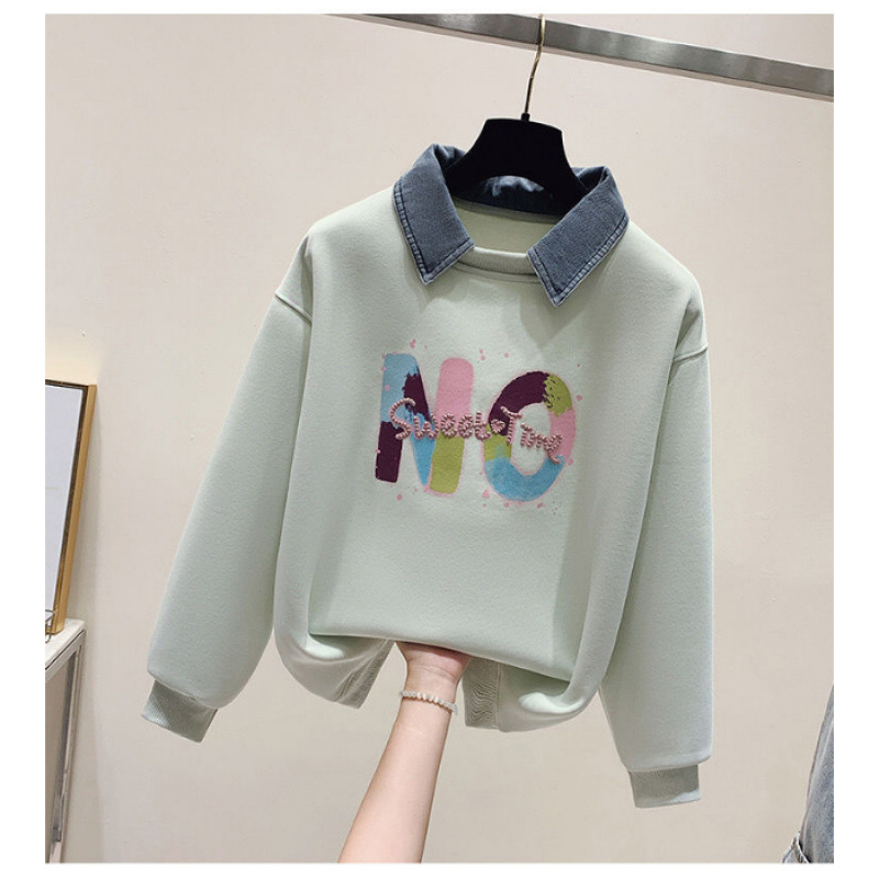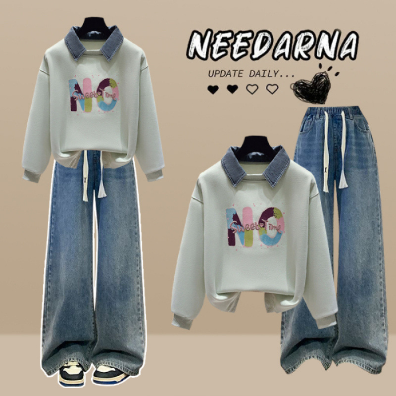 데님 세트 # 데님 스티칭 스웨터는 높은 허리 슬림 넓은 다리 청바지로 2 피스 긴 슬리브 탑을 가짜로 만듭니다.스토어 가기