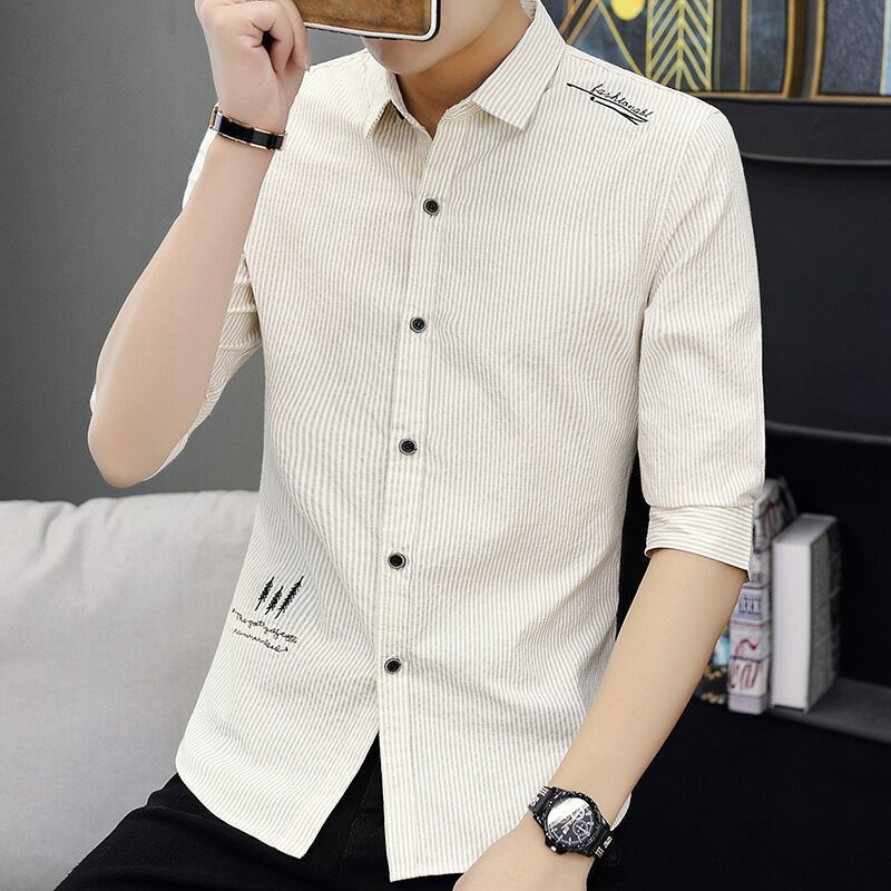 2022 년 여름 새 도착 중소매 셔츠 남성용 슬림 한식 줄무늬 셔츠 봄 올매치 반팔 셔츠