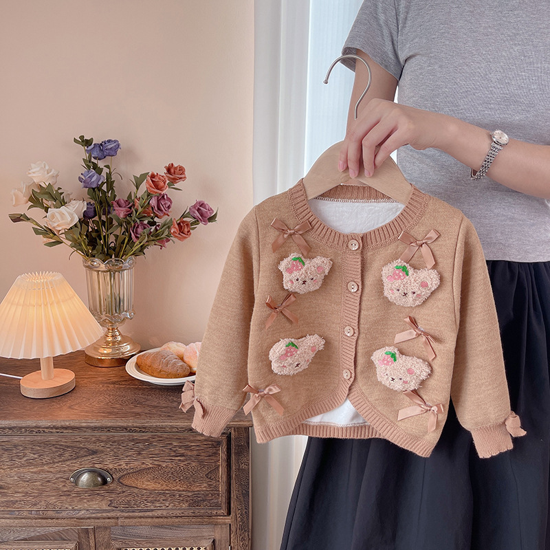 • 카키 [KF379 여아 자수 곰머리 가디건]