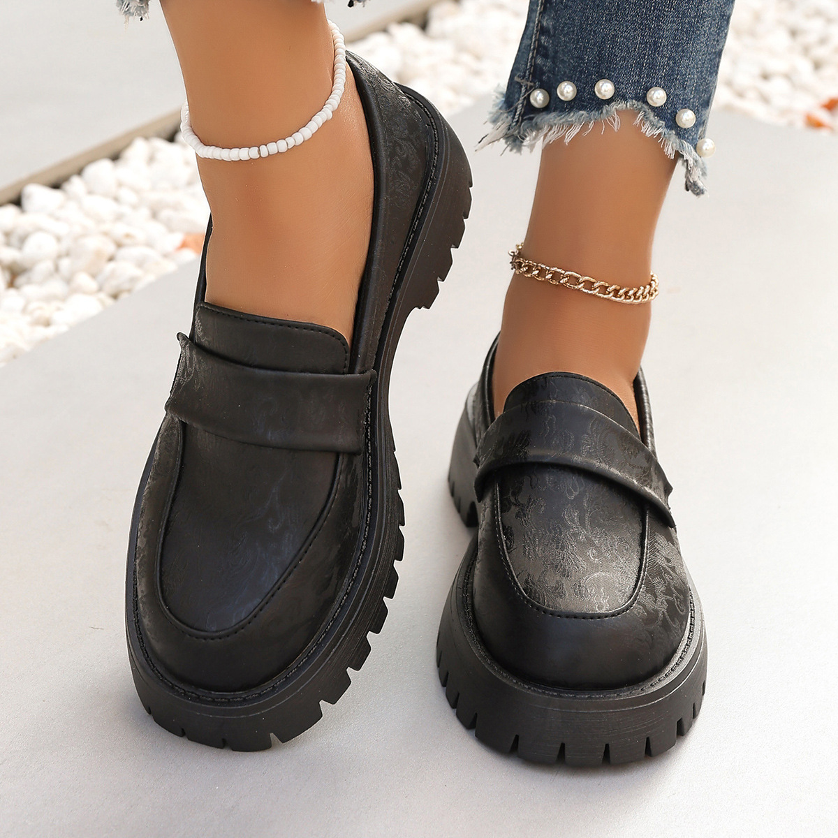 2025 봄과 가을 새로운 대외 무역 플랫폼 두꺼운 밑창 영국 스타일 슬립 온 여성용 작은 가죽 신발 라운드 발가락 로퍼 여성 신발 유행스토어 가기