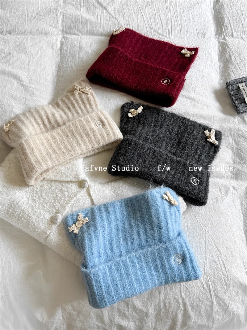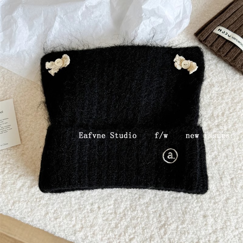 고양이 귀 니트 양모 모자 여성의 가을과 겨울 일본 스타일 레이스 버튼 활 얼굴 작은 따뜻한 방한 모자 차가운 모자
