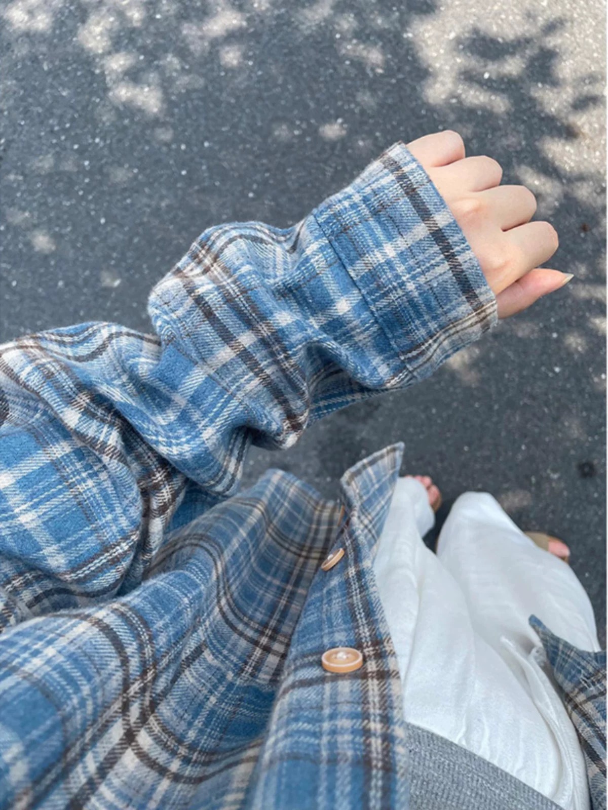 프렌치 블루 체크 샌딩 긴팔 셔츠 여성용 봄과 가을 느슨한 오버 사이즈 하라주쿠 스타일 캐주얼 올 매치 셔츠