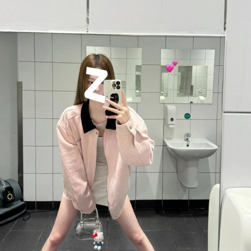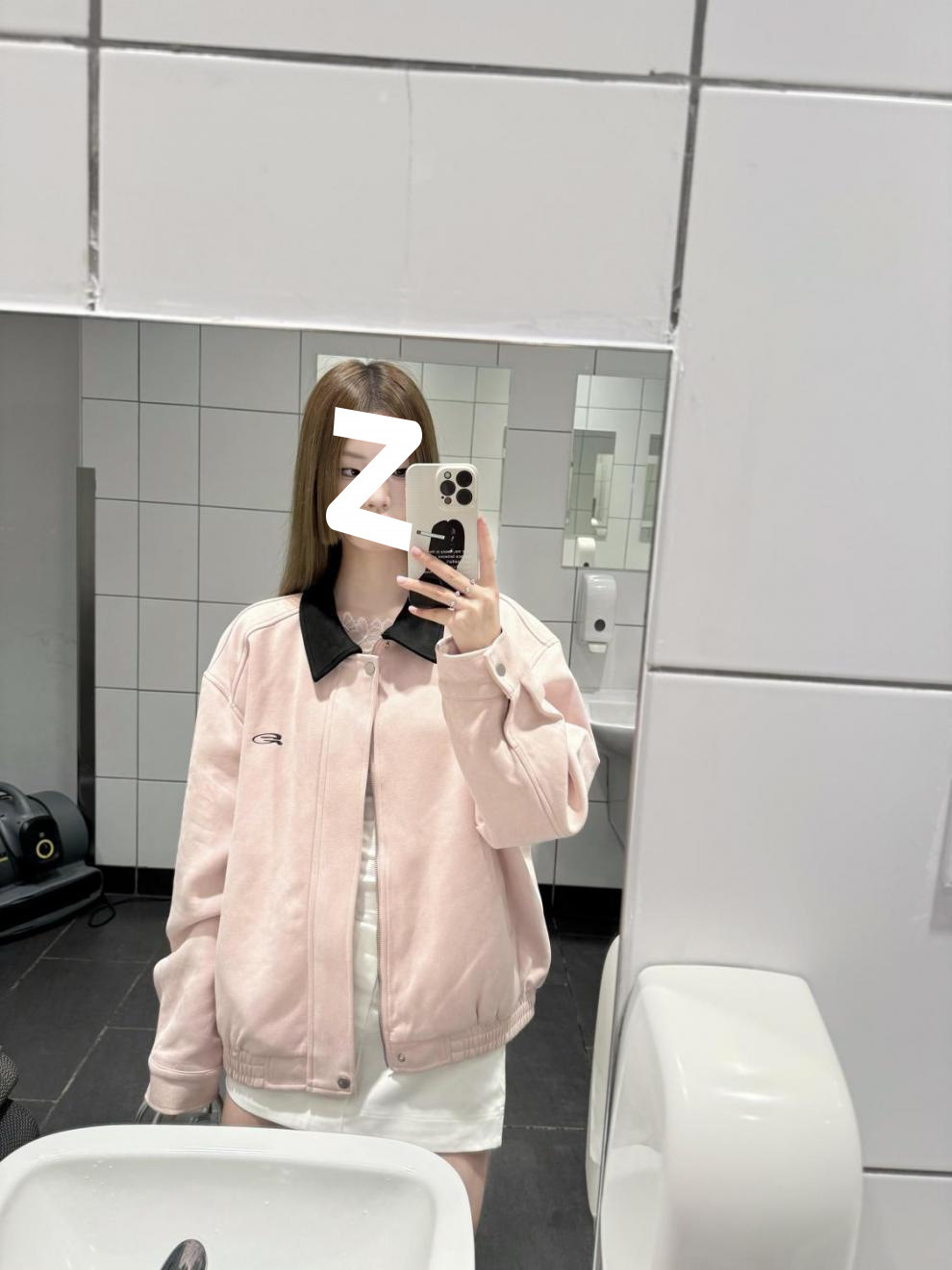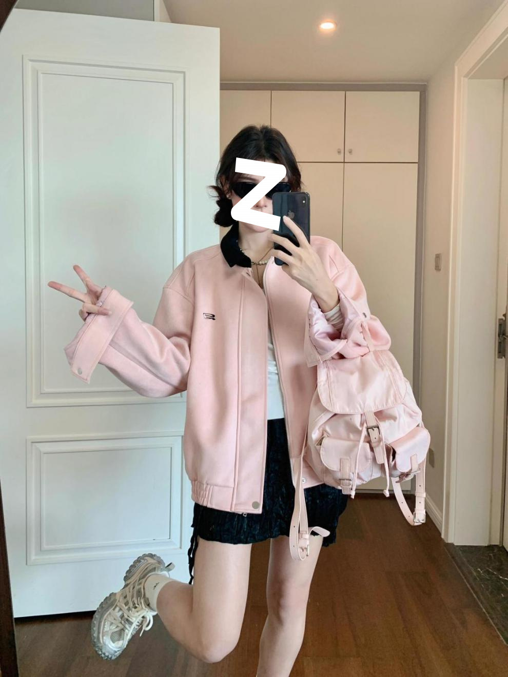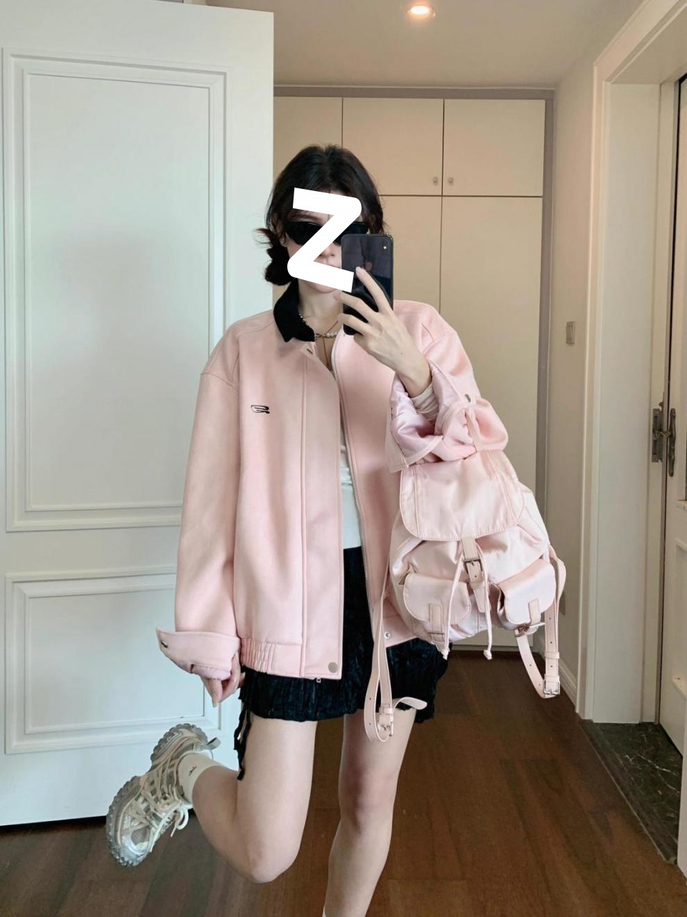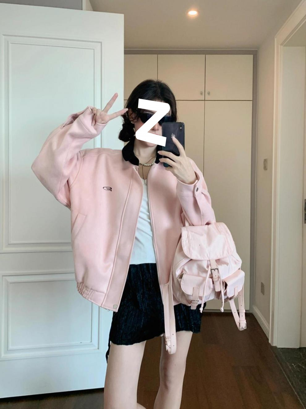 핑크 스웨이드 옷깃 지퍼 재킷 코트 여자 봄과 가을 느슨한 짧은 야구 세트 카디건 탑 초가을스토어 가기