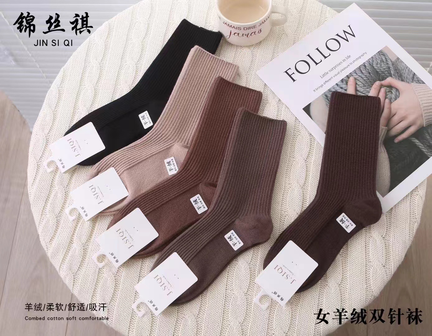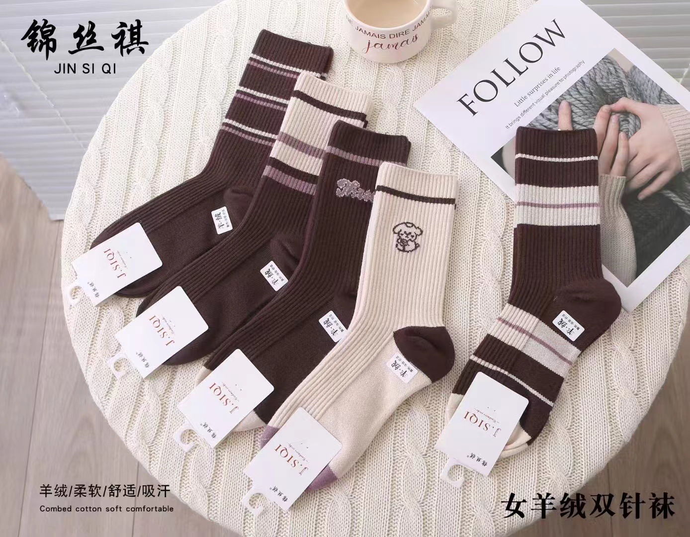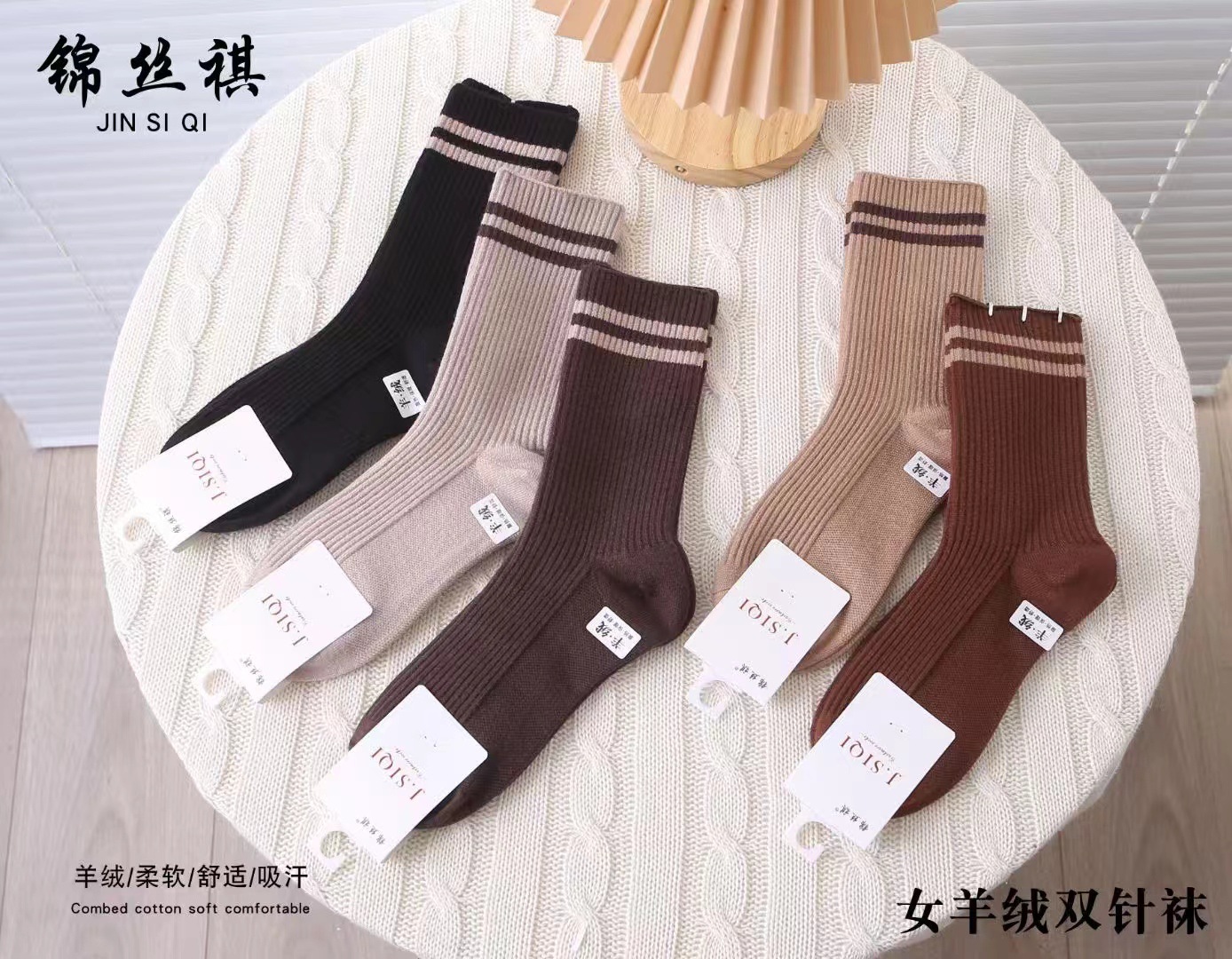 가을과 겨울 여성의 모조 더블 바늘 캐시미어 긴 배럴 스택 양말 다크 브라운 줄무늬 두꺼운 따뜻한 높은 송아지 양말 만화 트렌드
