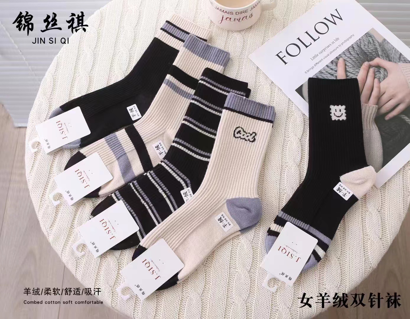 가을과 겨울 여성의 모조 더블 바늘 캐시미어 긴 배럴 스택 양말 다크 브라운 줄무늬 두꺼운 따뜻한 높은 송아지 양말 만화 트렌드스토어 가기