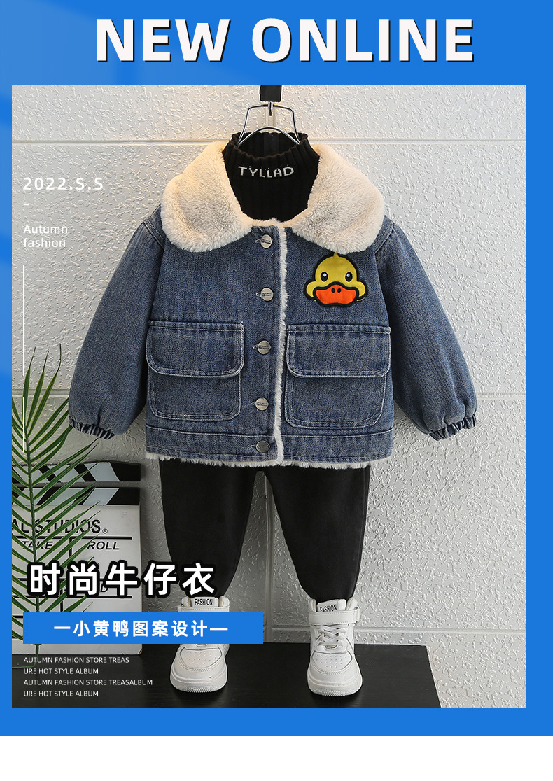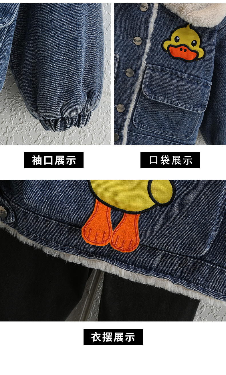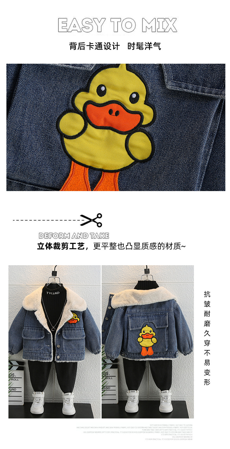 작은 노란색 오리 아동복 소년 기모 데님 코트 가을과 겨울 2024 새로운 남성 아기 두꺼운 옷 어린이 겨울 의류스토어 가기