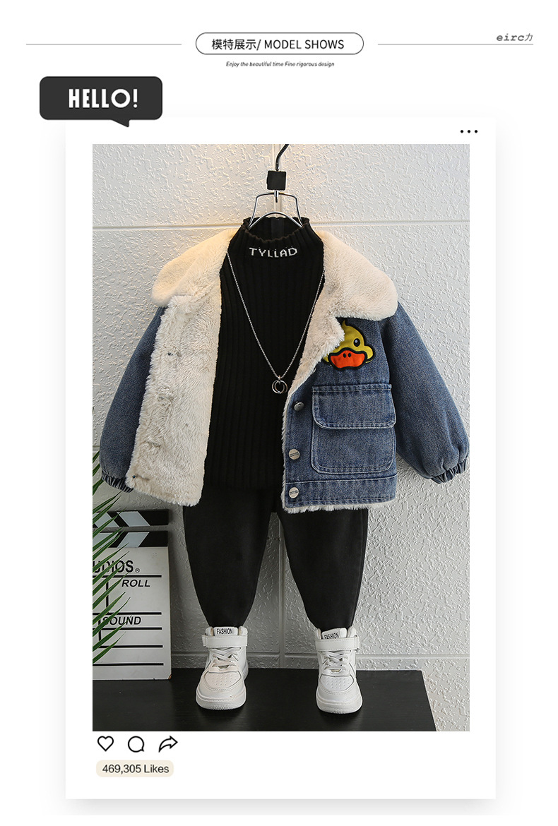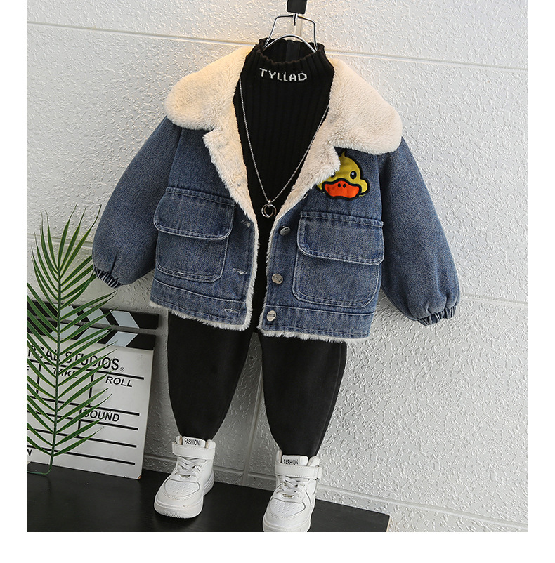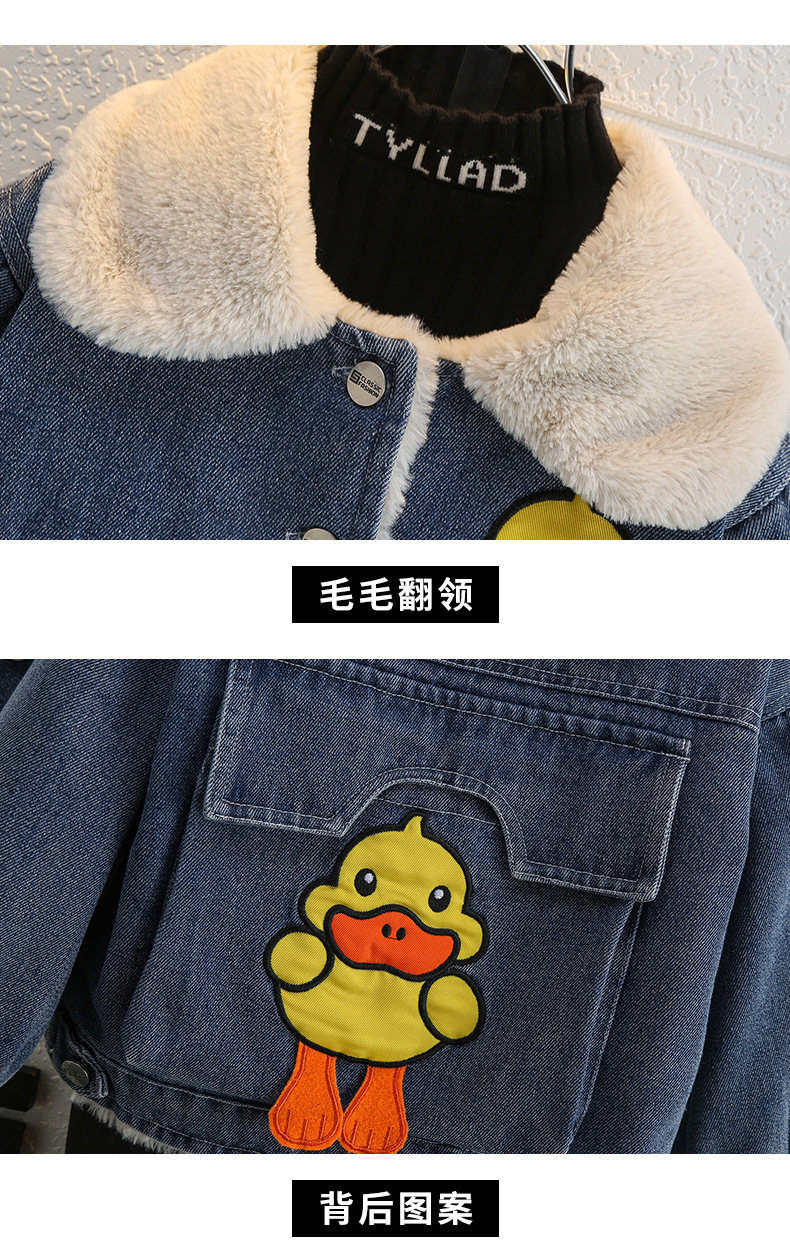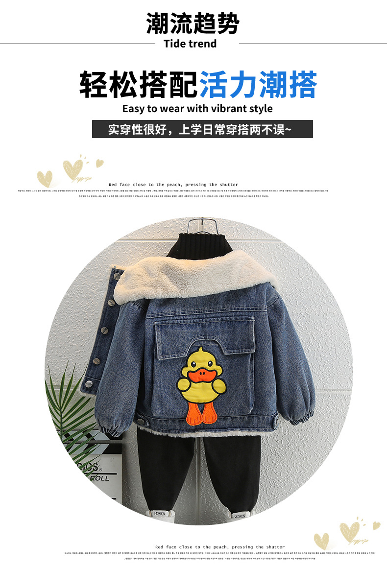 작은 노란색 오리 아동복 소년 기모 데님 코트 가을과 겨울 2024 새로운 남성 아기 두꺼운 옷 어린이 겨울 의류스토어 가기