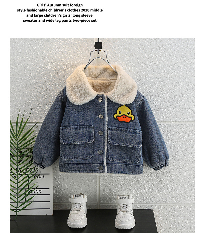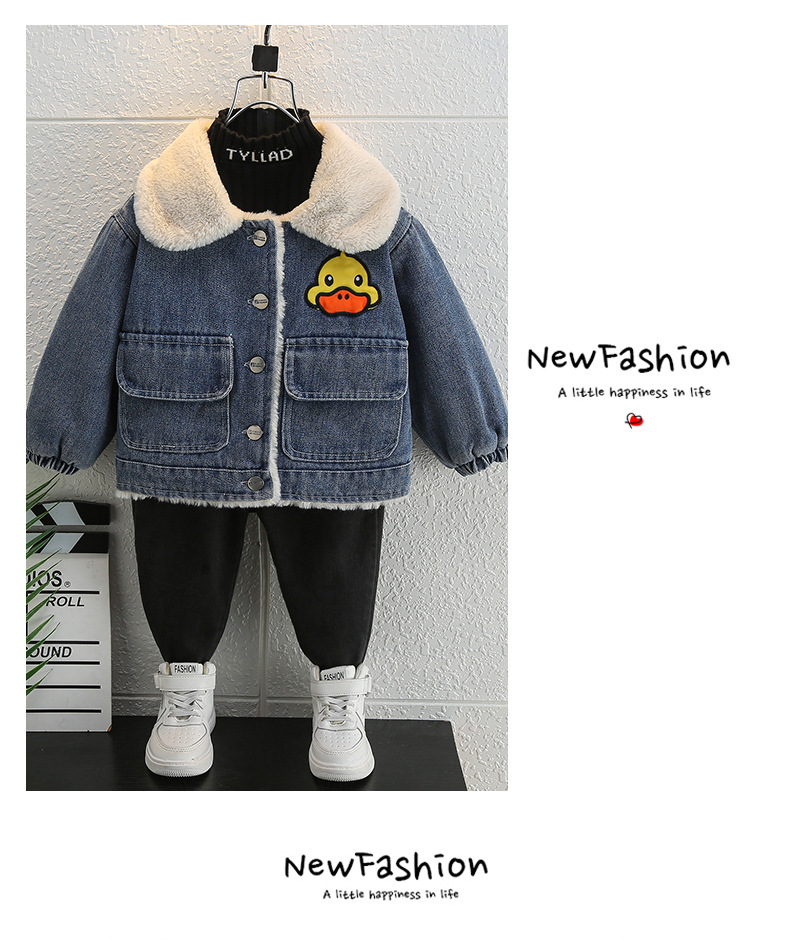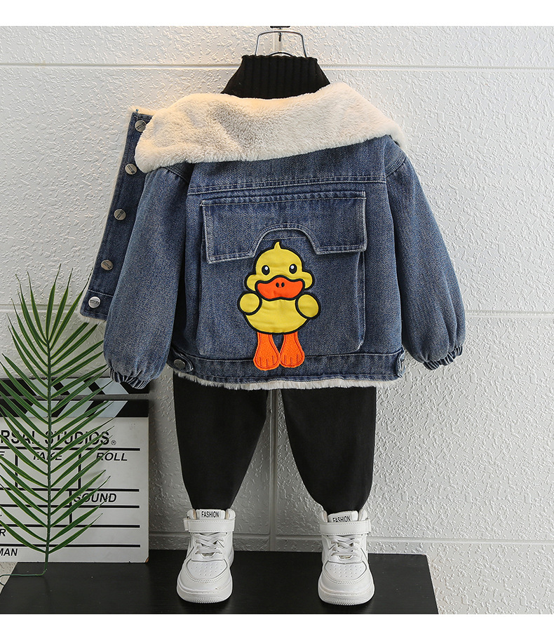 작은 노란색 오리 아동복 소년 기모 데님 코트 가을과 겨울 2024 새로운 남성 아기 두꺼운 옷 어린이 겨울 의류
