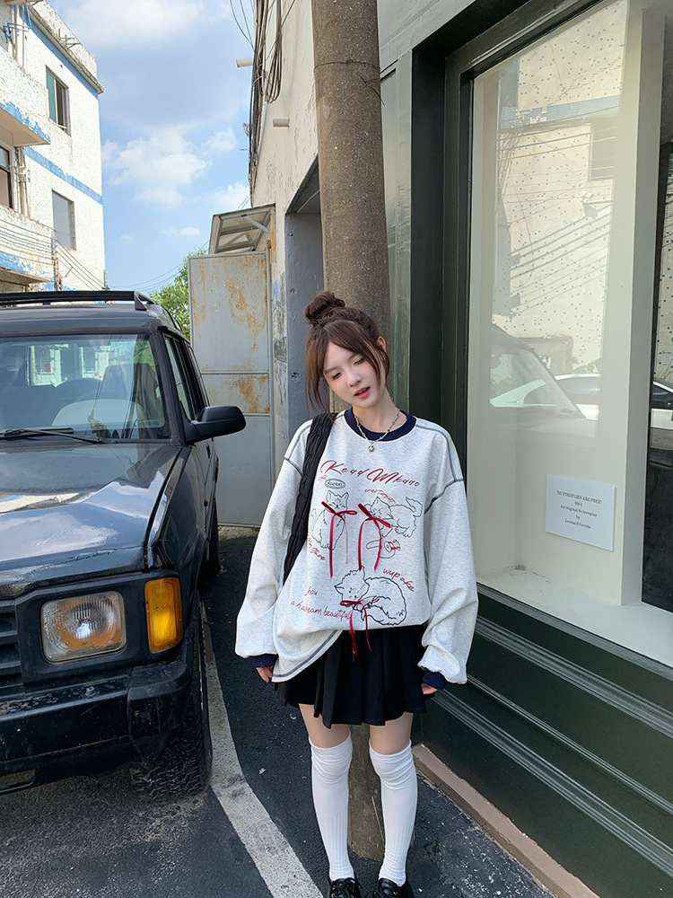 만화 고양이 인쇄 활 긴팔 스웨트 셔츠 여성의 가을 새로운 디자인 색상 대비 게으른 스타일 느슨한 탑