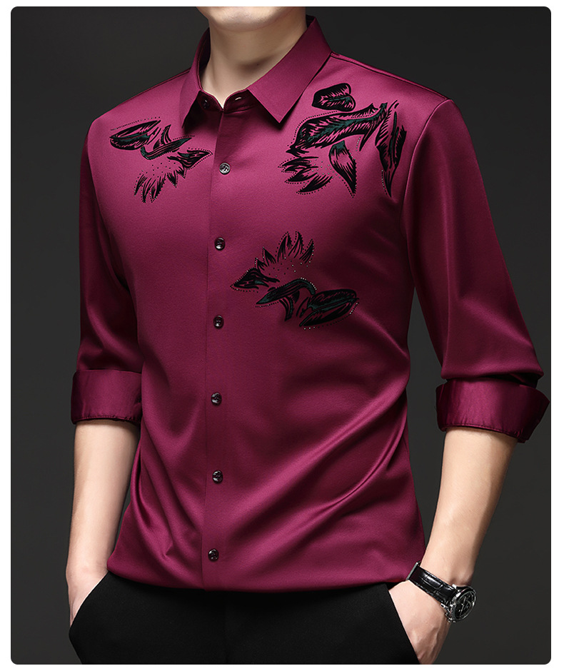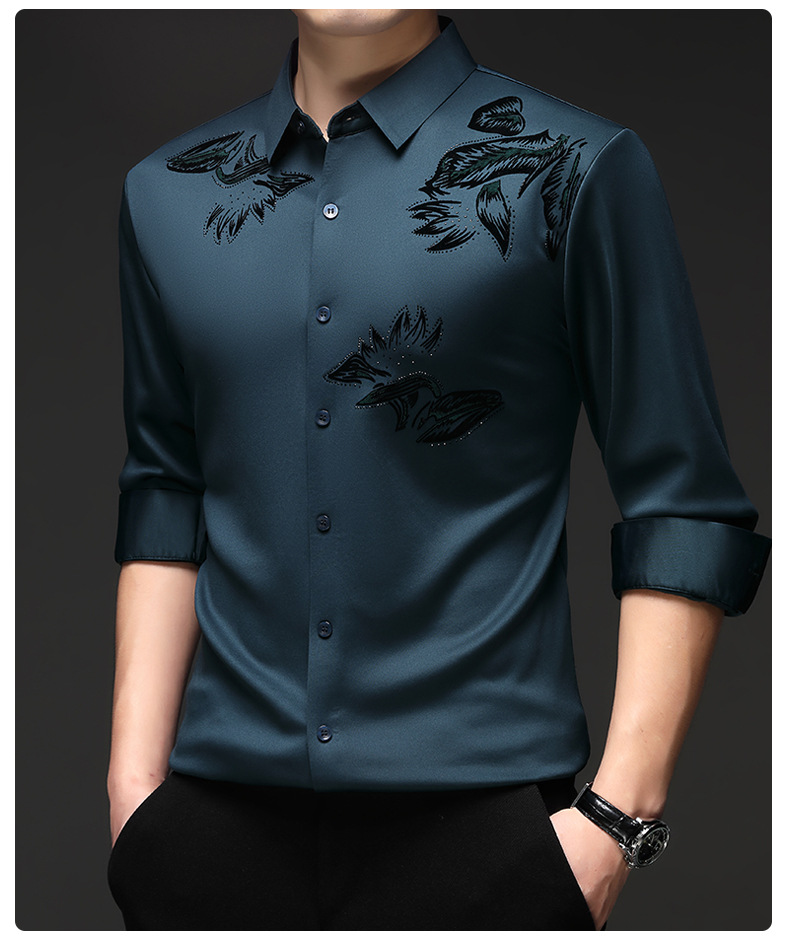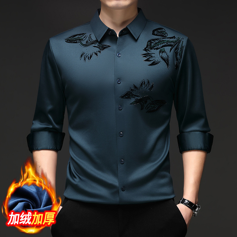 남성용 고급 원활한 핫 드릴링 꽃 그림 가을과 겨울 기모 긴 소매 젊고 중년 셔츠 비즈니스 캐주얼 아빠 셔츠