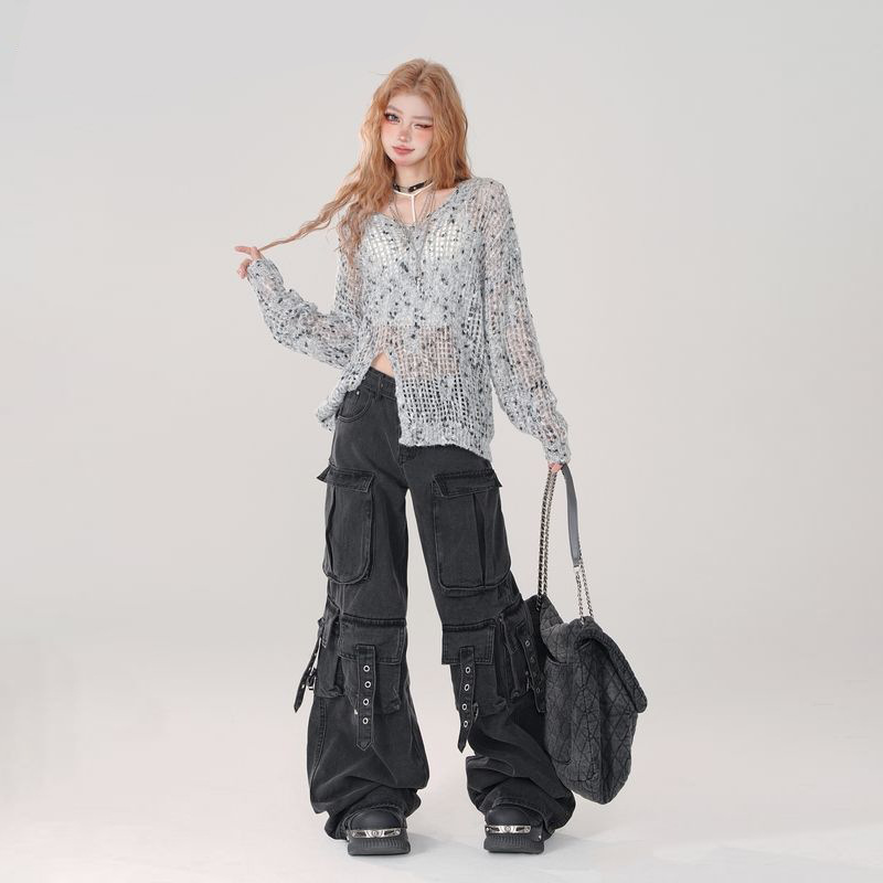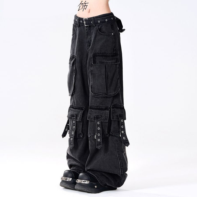 2025 여름 아메리칸 레트로 데님 워싱 워크웨어 청바지 여성 스트리트 디자인 스트레이트 루즈 와이드 팬츠