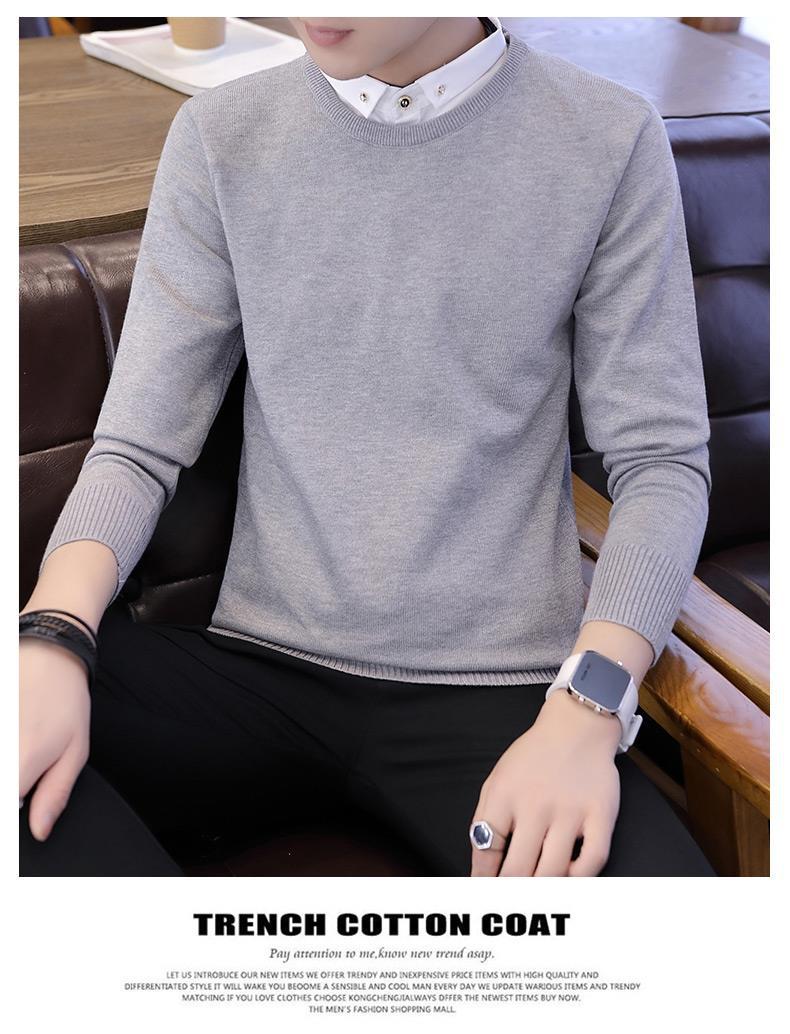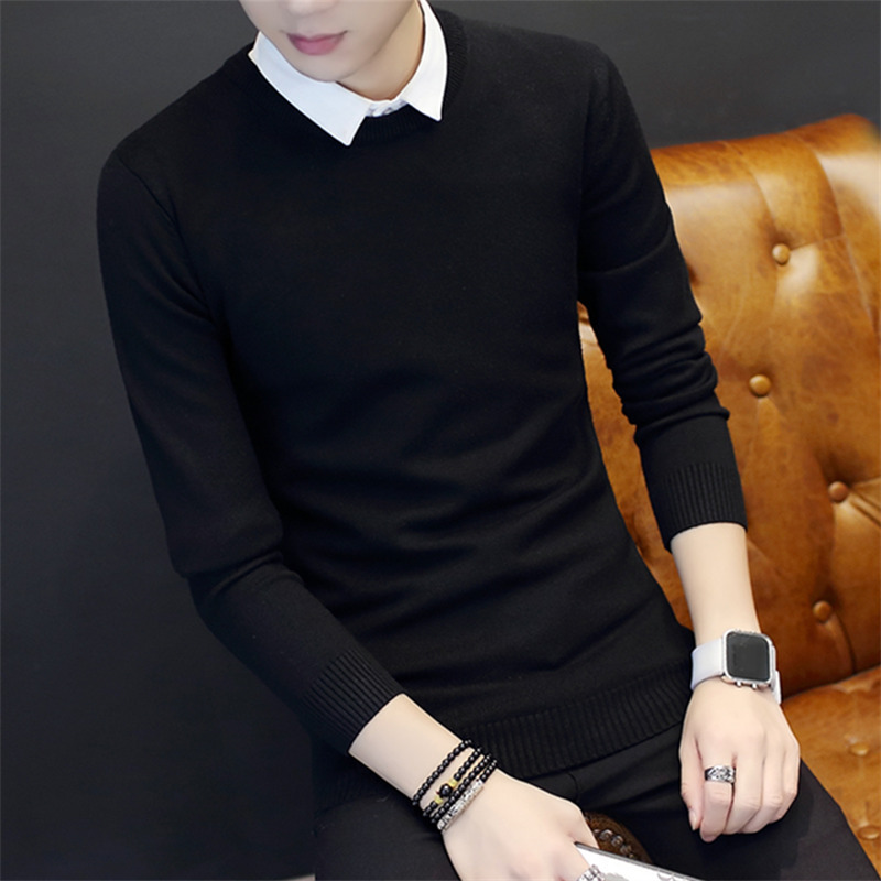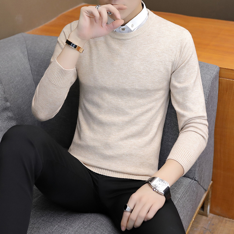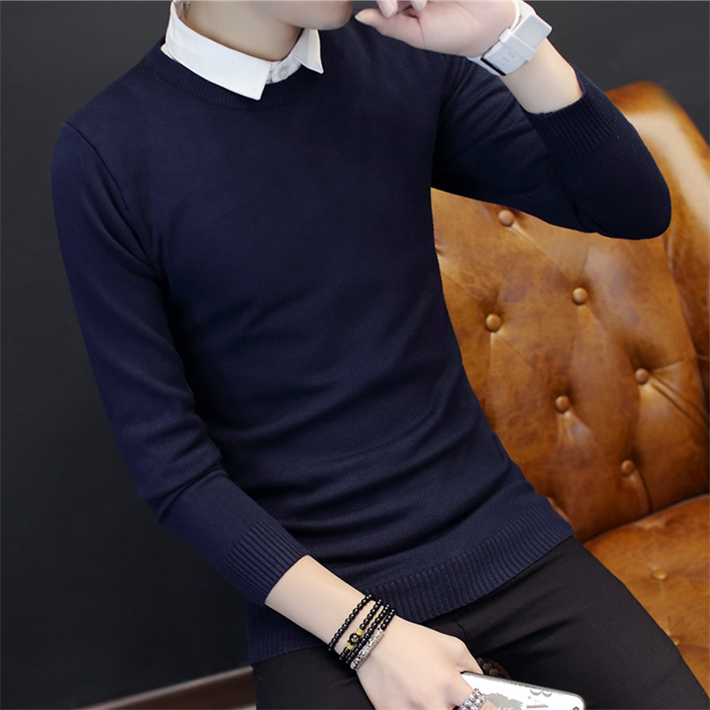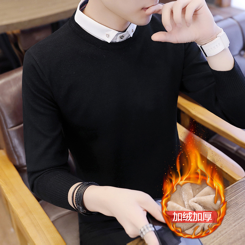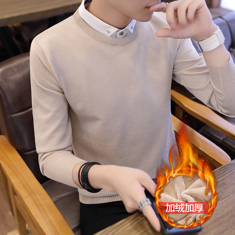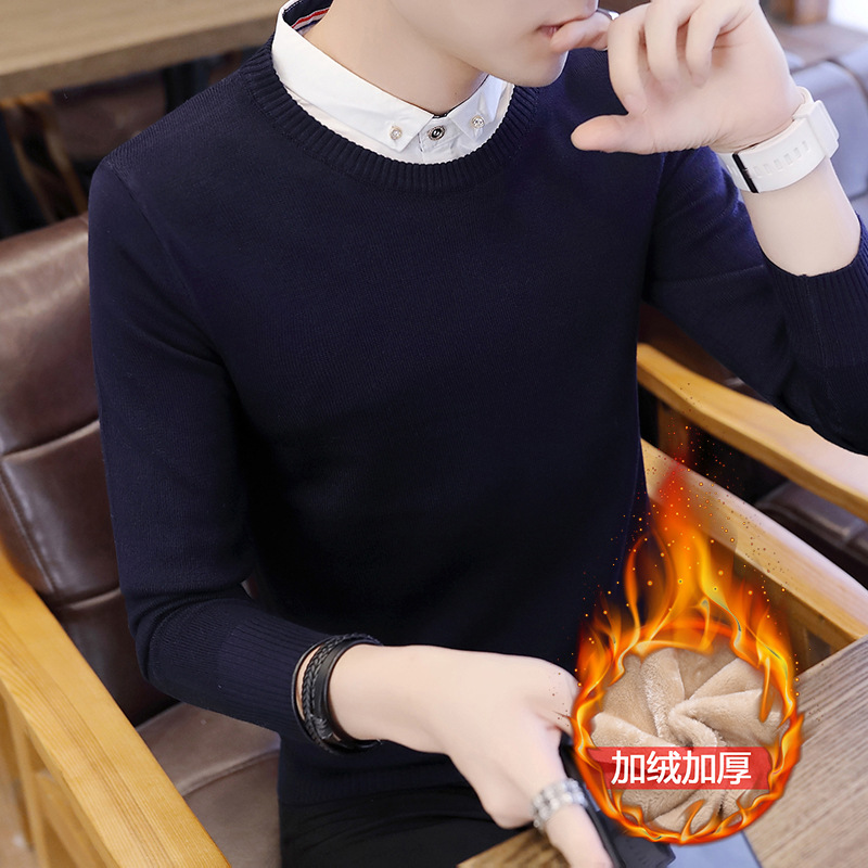 기모 두꺼운 스웨터 남자 겨울 2024 새로운 한국 스타일 가짜 투피스 내부 셔츠 칼라 Led 베이스 니트