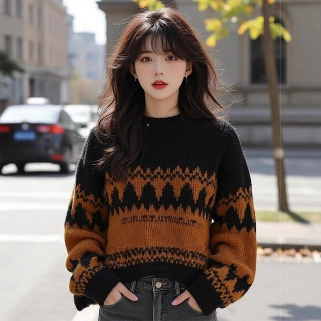 유럽 중공업 게으른 고급 두꺼운 검은 색 대비 스웨터 재킷 여성의 가을과 겨울 2024 새로운 니트 탑
