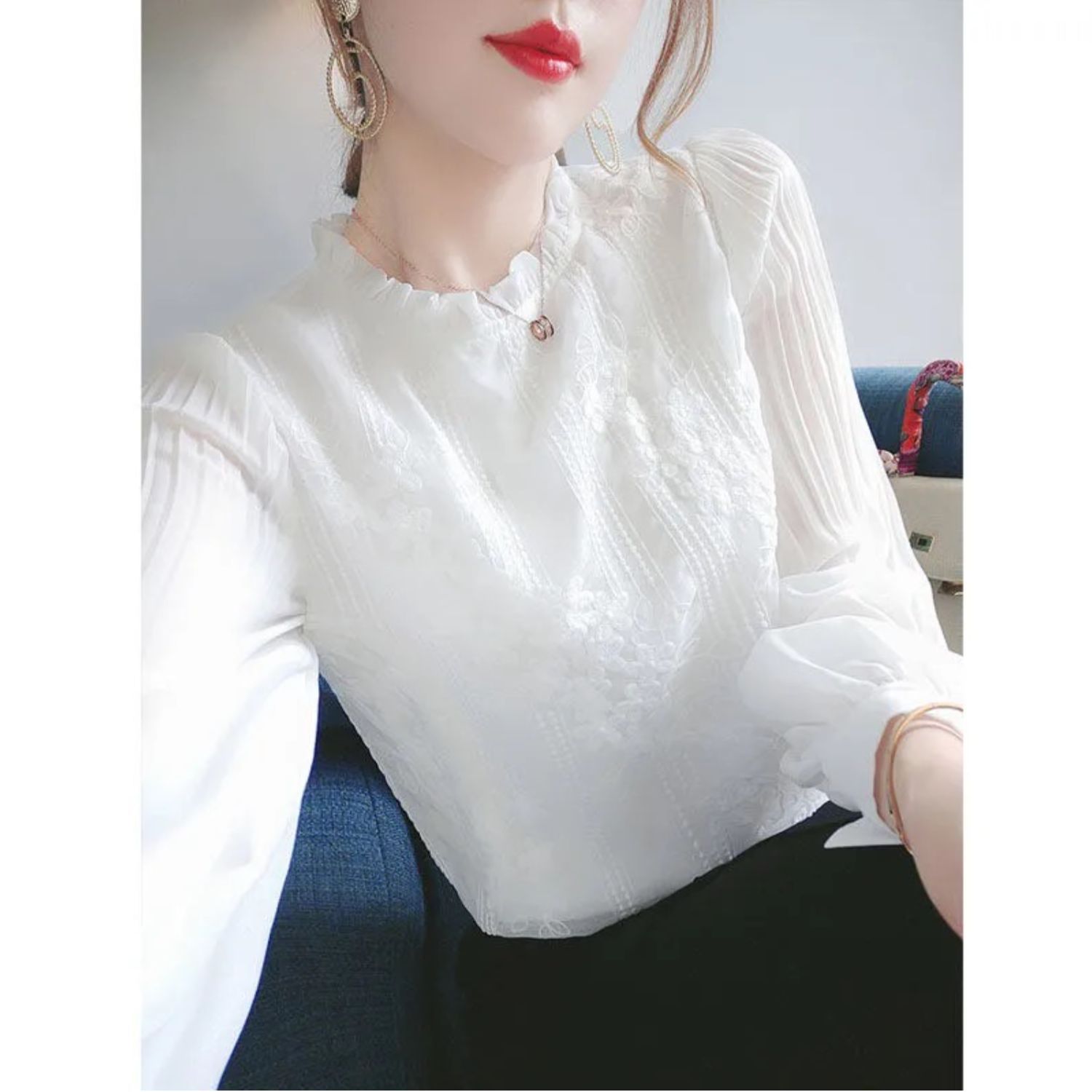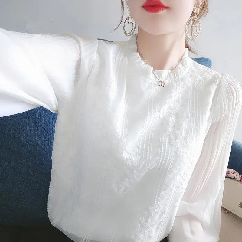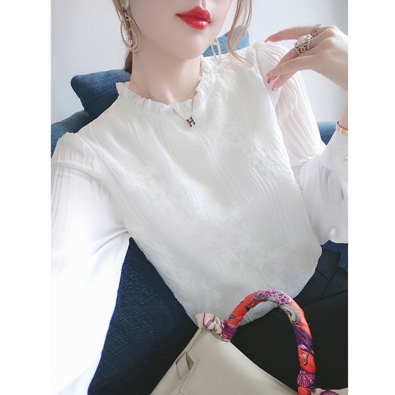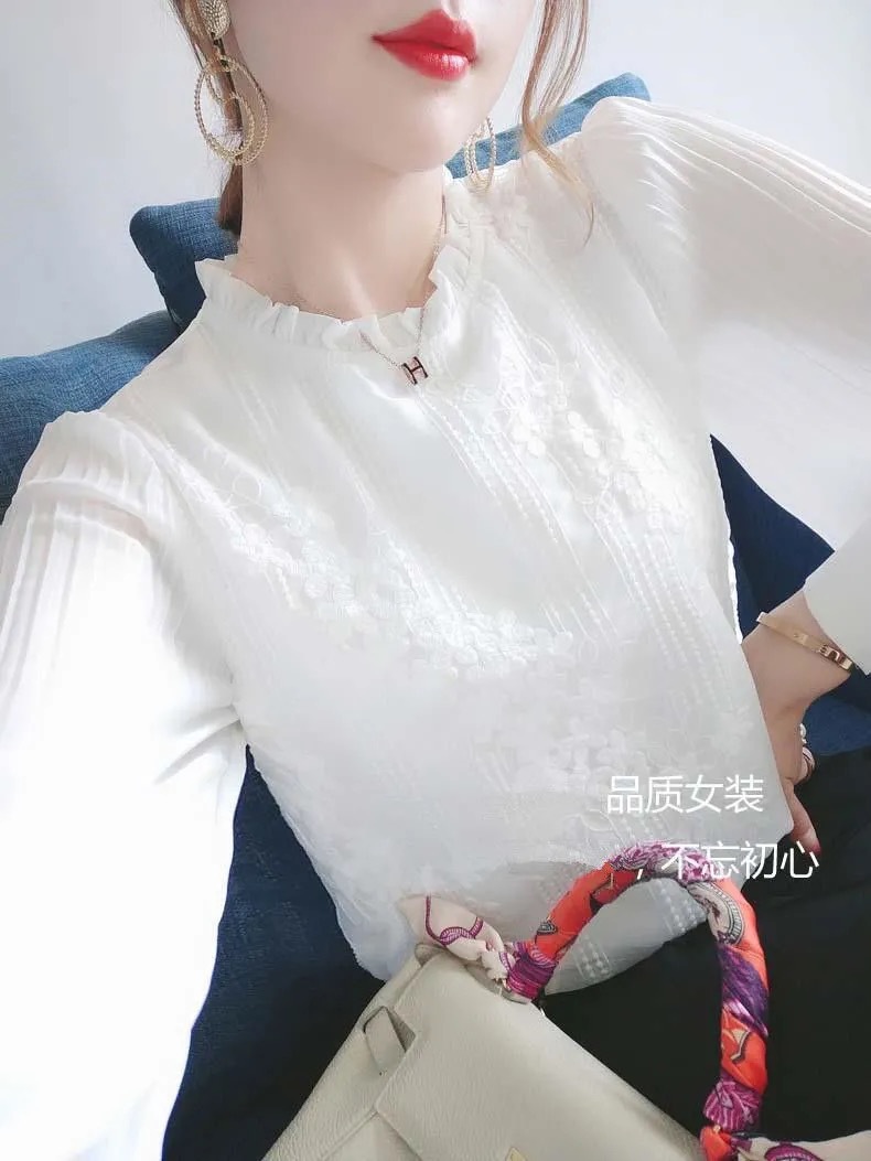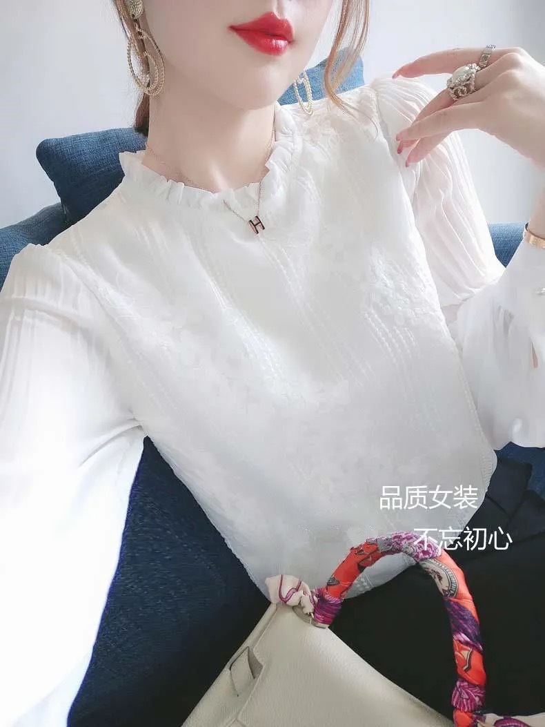 2104 시폰 셔츠 여성용 봄과 가을 서양식 느슨한 내부 칼라 셔츠 여성용 레이스베이스 셔츠 긴팔 탑스토어 가기