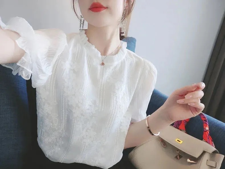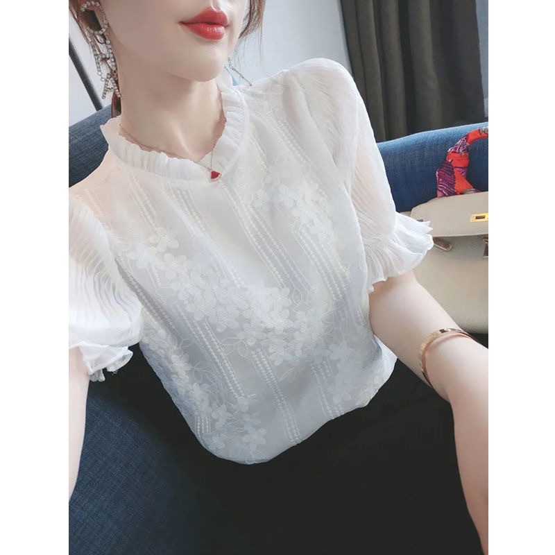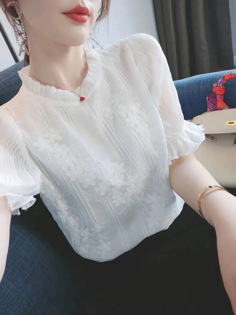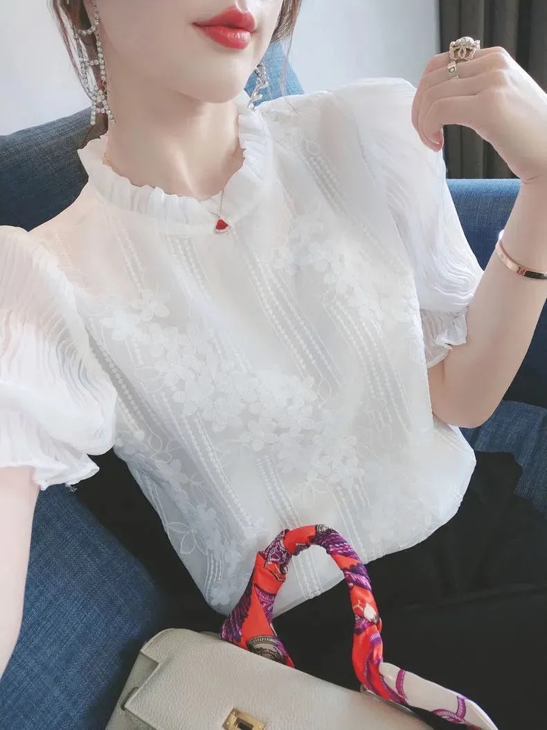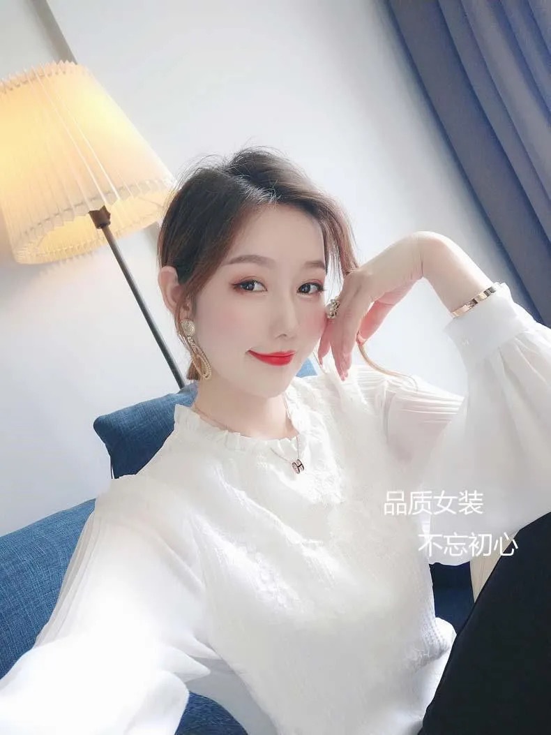 2104 시폰 셔츠 여성용 봄과 가을 서양식 느슨한 내부 칼라 셔츠 여성용 레이스베이스 셔츠 긴팔 탑스토어 가기