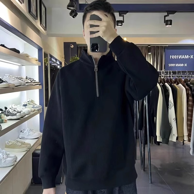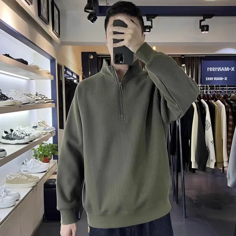 가을과 겨울 새로운 스트라이프 텍스처 탑 트렌디 한 느슨한 올 매치 Maillard 스웨터 긴소매 남성용 스탠드 칼라 지퍼스토어 가기